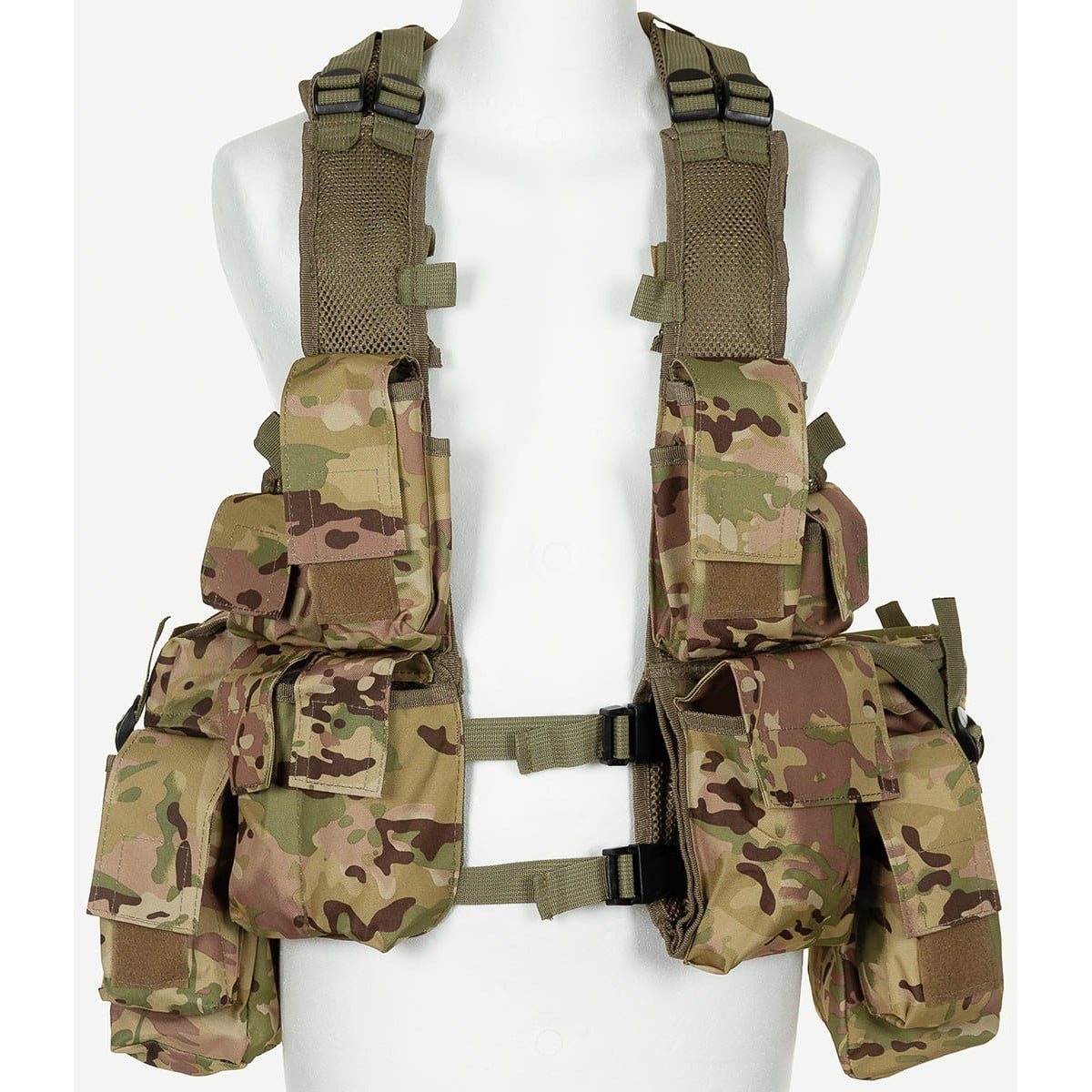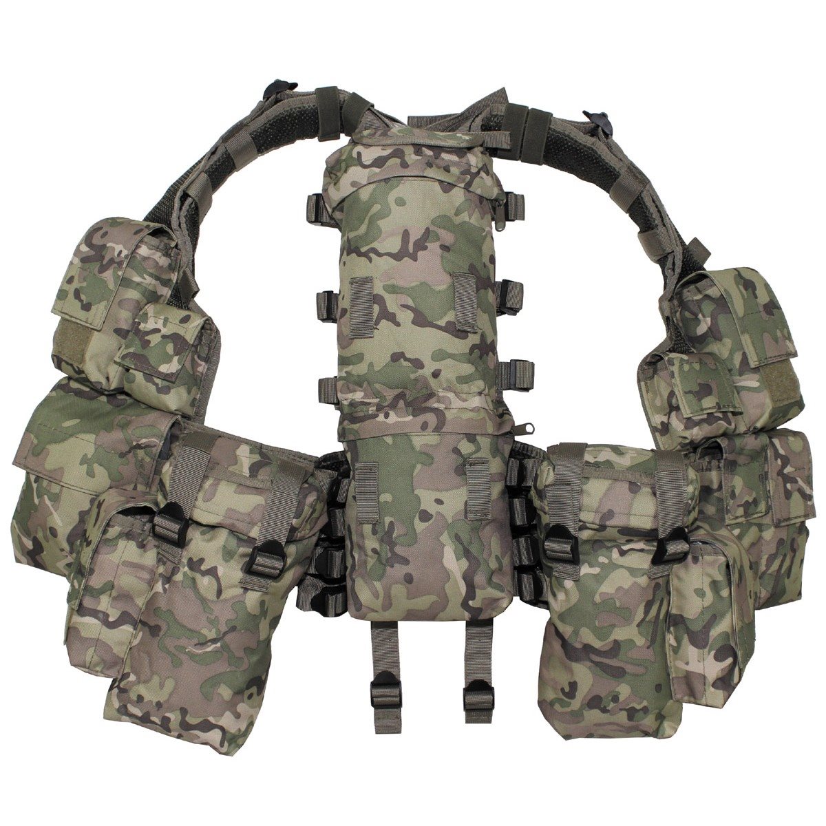Ce gilet tactique sans ceinture est doté de bretelles rembourrées et de nombreuses poches pratiques. Au dos, il comporte une poche pour une poche à eau, deux grandes poches utilitaires, une poche pour une trousse de secours, deux poches universelles, deux poches pour grenades et quatre poches pour chargeurs. Comme la longueur et la largeur du gilet sont réglables, quatre pochettes pour chargeurs. La longueur et la largeur du gilet étant réglables, il est facile de l'ajuster à votre morphologie. Gilet tactique universel pour une utilisation polyvalente.