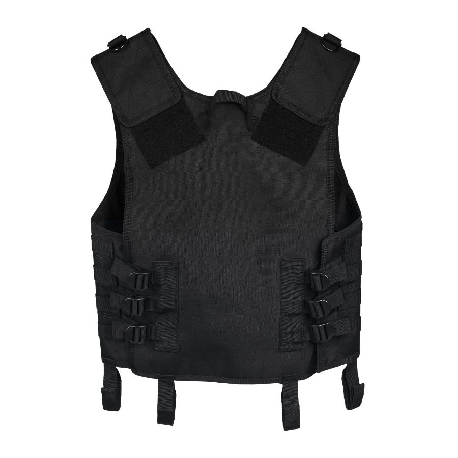 Gilet tactique confortable fabriqué en polyester résistant. Il se ferme à l'aide d'une fermeture éclair centrale solide, complétée par trois boucles FASTEX en plastique. Le gilet peut être facilement ajusté sur les côtés à l'aide de boucles et au niveau des épaules à l'aide de velcro. La partie avant du gilet est recouverte d'un système de fixation MOLLE/PALS qui vous permet d'attacher des équipements supplémentaires compatibles. À l'arrière, vous trouverez une poignée de sauvetage. Six boucles sont disponibles dans la partie inférieure pour attacher une ceinture.