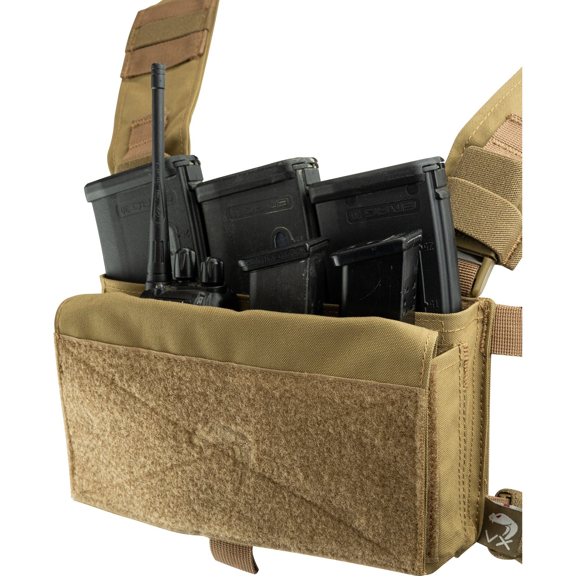 Le chest rig se compose essentiellement d'une double poche doublée de molleton avec un rabat amovible à fermeture velcro et des sangles de transport fixées par des boucles fastex. Le chest rig fait partie de la gamme de produits Viper VX, qui comprend des accessoires compatibles en option. Par exemple, des inserts élastiques à velcro pour ranger différents types de chargeurs (.308 / .223 / mitraillettes / pistolets / fusils de chasse) ou des pistolets. La capacité de charge du chest rig peut être encore augmentée en fixant une pochette ventrale ou des poches latérales avec une attache modulaire à velcro à l'arrière du gilet.