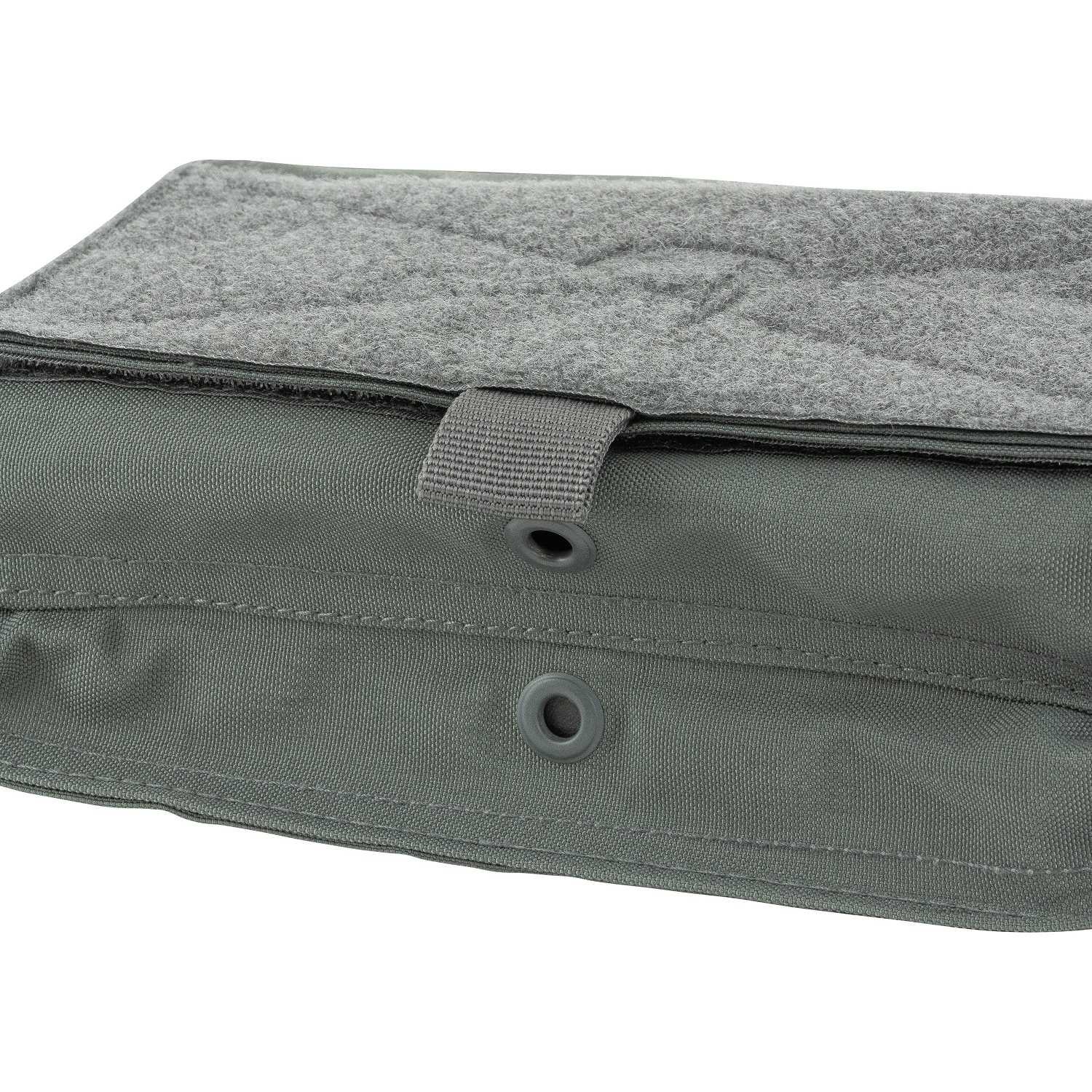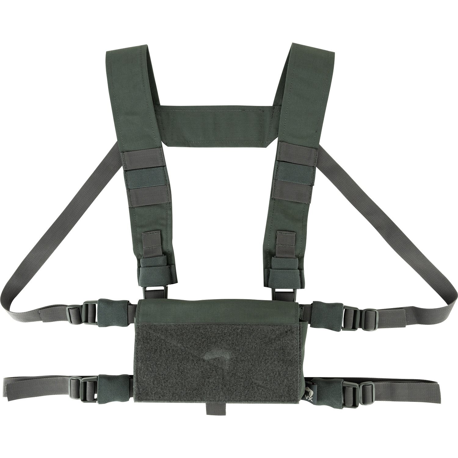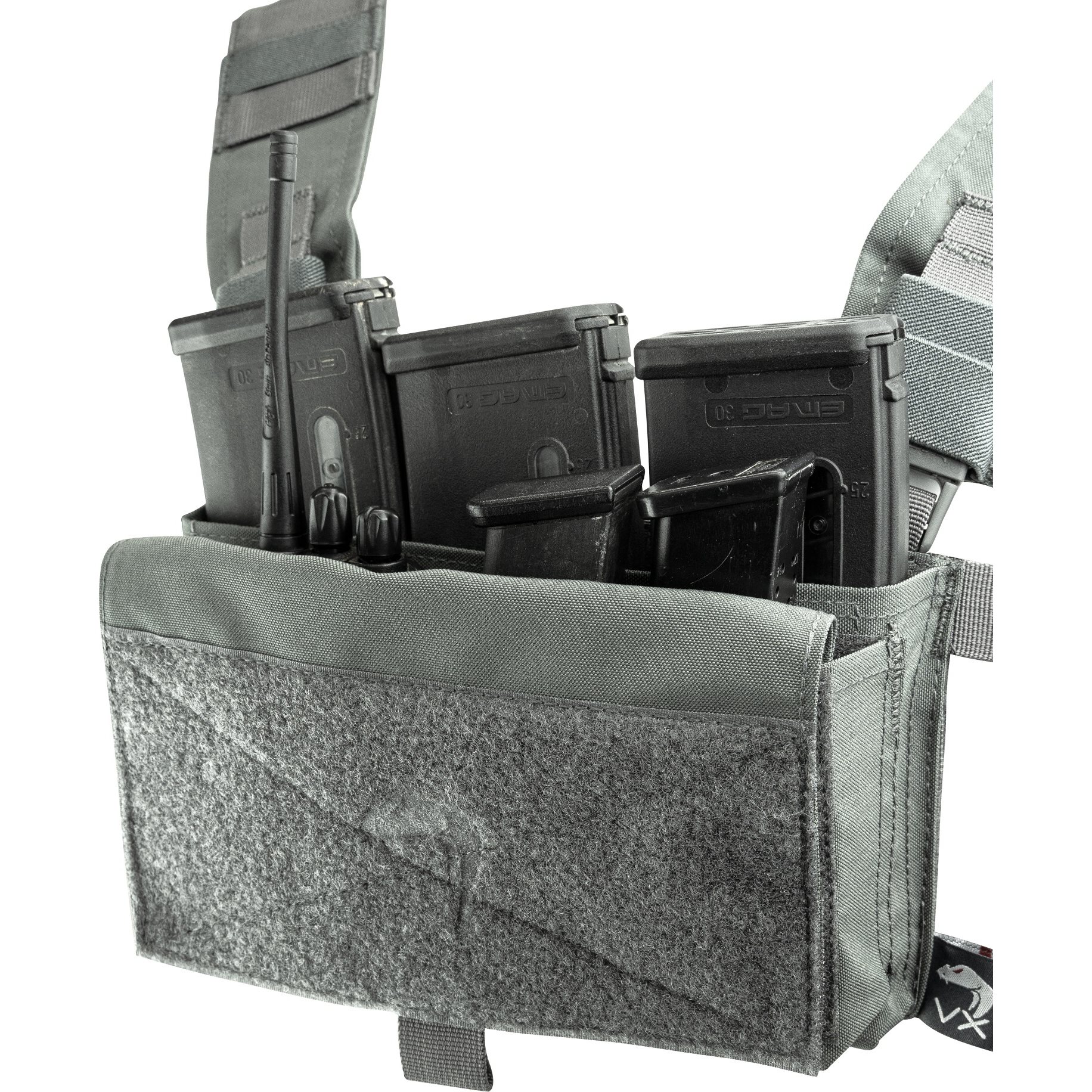 Après avoir détaché les sangles de transport, il est possible de fixer le chest rig à des gilets pare-balles / porte-plaques compatibles (par exemple VX Buckle Up Gen2) à la place du panneau avant.