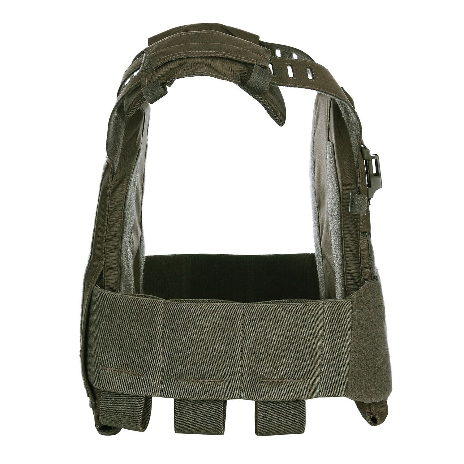 Sur le devant du gilet, vous trouverez un panneau avec une fixation MOLLE, qui est également recouvert de velcro. À côté du panneau se trouvent deux boucles FASTEX femelles qui servent à fixer des équipements supplémentaires. Le dos du gilet est entièrement recouvert d'une autre fixation MOLLE/PALS comprenant six colonnes au total. Les côtés du gilet sont élastiques et comportent trois « fentes » pour ranger des équipements tels que des chargeurs, des radios, des garrots, etc. Ils sont également équipés de velcro à l'extérieur, il est donc possible d'y fixer des pochettes ou des étuis compatibles de différents fabricants. Il est bien sûr possible de régler la taille du gilet dans son ensemble. Les bretelles sont généreusement rembourrées (le rembourrage peut être retiré si nécessaire), réglables en taille et équipées de passages pour le tuyau du sac d'hydratation. Le gilet est compatible avec les plaques SAPI de la plupart des tailles et peut être complété par un rembourrage intérieur supplémentaire pour améliorer le confort et la circulation de l'air.