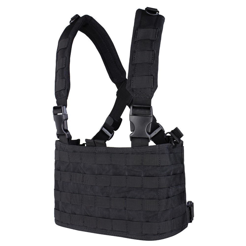 Gilet OPS Chest Rig du fabricant américain Condor Outdoor, gilet tactique de coupe classique avec un grand panneau avant équipé d'une liaison PALS pour l'ajustement individuel des accessoires MOLLE. Le panneau comporte quatre rangées de sangles PALS, deux poches ouvertes intégrées sur les côtés pour les chargeurs et une poche principale à l'avant de 18 x 28 cm, par exemple pour une carte. Le panneau est équipé de bretelles rembourrées croisées dans le dos avec des boucles arrière pivotantes Swivi Lockster fastex . Dans la partie supérieure, les sangles sont équipées d'anneaux en D. Le gilet est doté d'une sangle lombaire réglable des deux côtés.