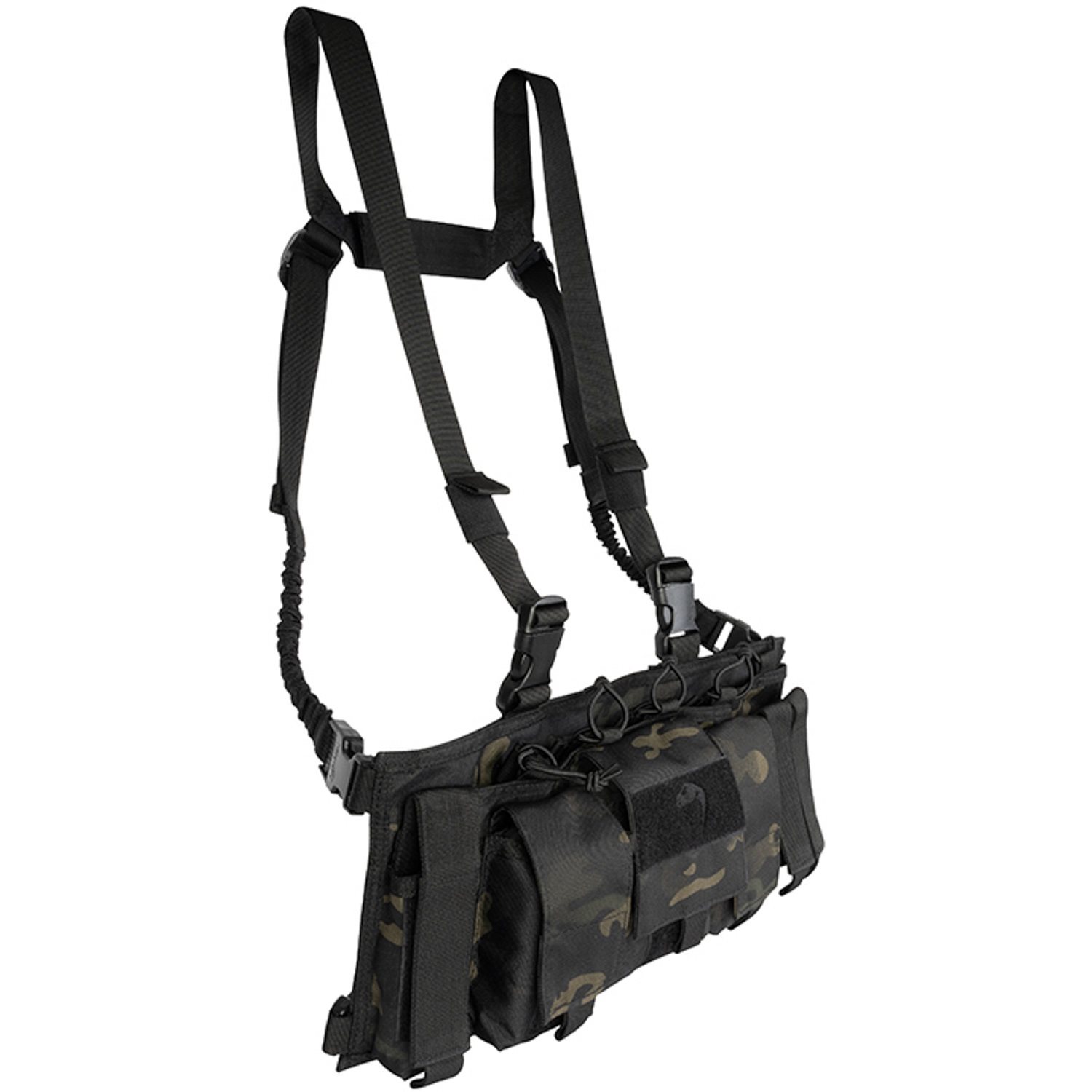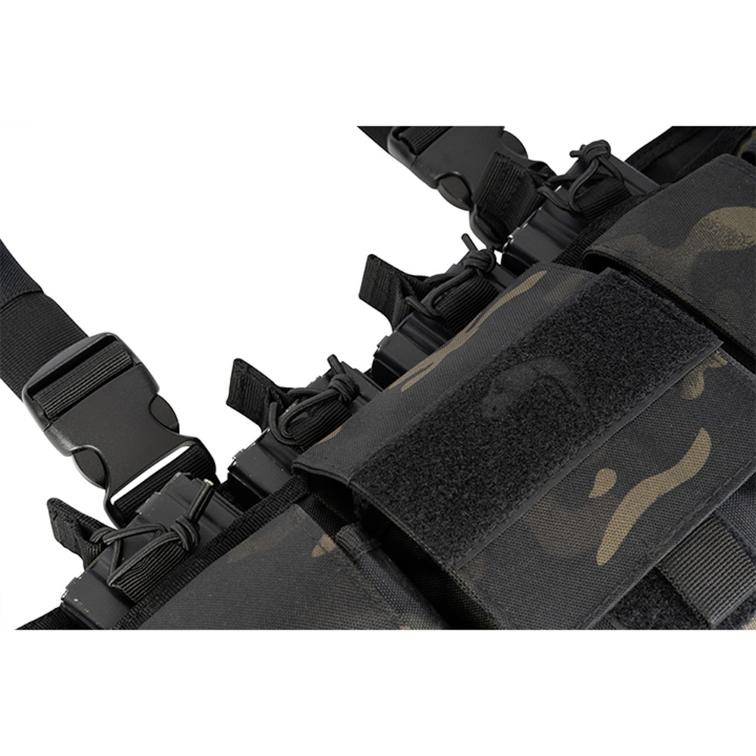 Le chest rig est équipé d'une pochette ouverte à quatre compartiments avec un cordon élastique pour les chargeurs de type AR15. Il est également possible d'y insérer des chargeurs d'autres armes de dimensions similaires, mais en raison des séparations en élastique, elle ne convient pas aux chargeurs à bec (AK) ou à protubérances plus prononcées (G36, BREN A1).