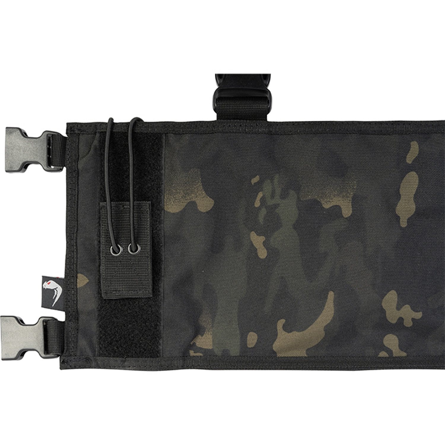 Sur la face avant de la pochette à quatre compartiments se trouvent trois poches universelles pour les petits équipements, fermées par des rabats à velcro. La poche centrale, plus grande, est également dotée d'un panneau velcro avec le logo Viper estampé sur la partie visible du rabat. Sur le côté gauche du gilet se trouve un étui pour radio combiné à une double pochette pour chargeurs de pistolet, lampe torche ou pince multiprise. La radio est maintenue dans l'étui par un cordon élastique réglable en longueur. Les pochettes pour pistolets sont fermées par des rabats à velcro. Sur le côté droit de la veste se trouve une dernière pochette, légèrement plus grande que celle destinée au chargeur de pistolet. Cette pochette est fermée par un rabat à velcro réglable en longueur et amovible.