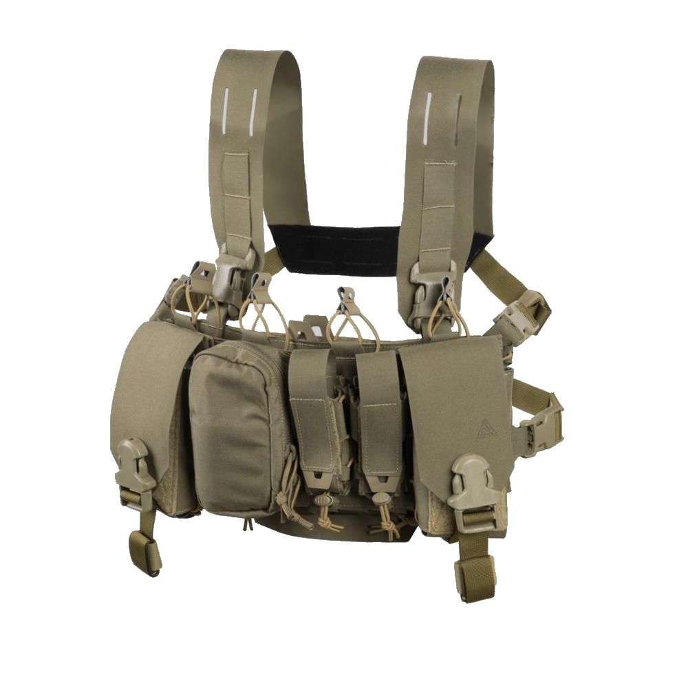 Le chest rig comporte quatre pochettes ouvertes pour les chargeurs AR15, AK ou les armes de calibre .308 Win. Les chargeurs sont maintenus en place par des cordons élastiques amovibles avec des tirettes. Les pochettes peuvent être adaptées aux chargeurs utilisés en réglant le serrage périphérique (à l'aide d'un cordon élastique et d'un frein).