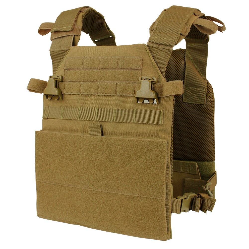 Le support seul, sans autres accessoires, constitue une solution discrète pour le transport d'une protection balistique et permet d'insérer des plaques SAPI de taille moyenne ou grande, mesurant jusqu'à 10,25 x 13,25 pouces (260 x 337 mm). Les plaques sont insérées dans les poches du support à l'aide d'un rabat inférieur à fermeture velcro et leur position à l'intérieur de la poche est en outre sécurisée par une autre sangle à fermeture velcro. sont insérées dans les poches du support à l'aide d'une patte inférieure à velcro et leur position à l'intérieur de la poche est en outre sécurisée par une autre sangle à velcro. La moitié inférieure de la face avant est constituée d'un panneau à velcro destiné à la fixation d'une plate-forme avant et/ou de côtés modulaires (cummerbund) en option. Derrière ce panneau se trouve une poche de rangement pour un couteau de poche.