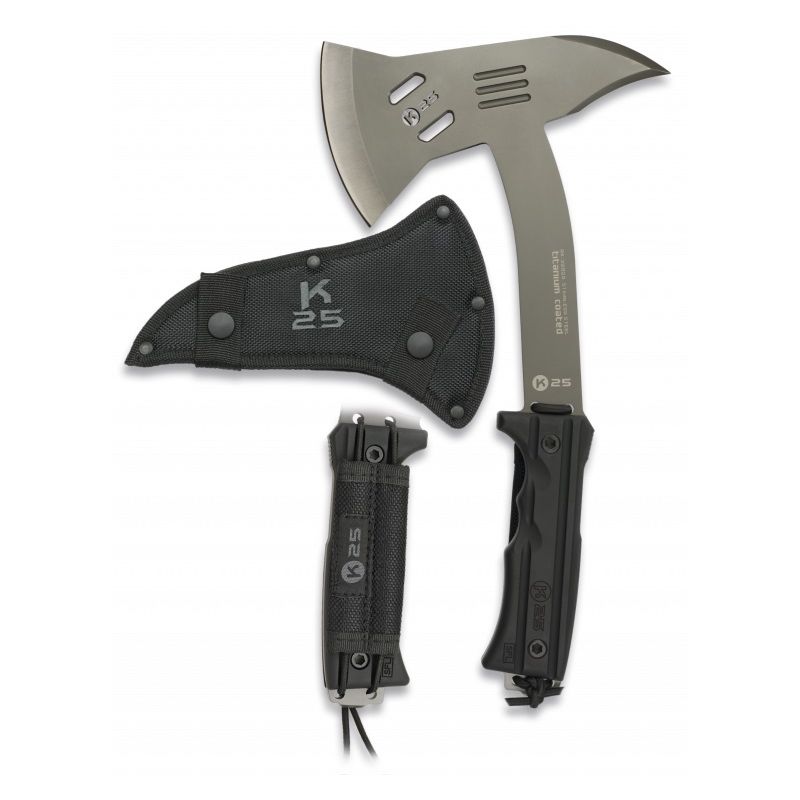 Hache d'extérieur K25 TACTICAL 32023 entièrement métallique avec poignée antidérapante et boucle de fixation. Livrée avec étui. Plus d'informations