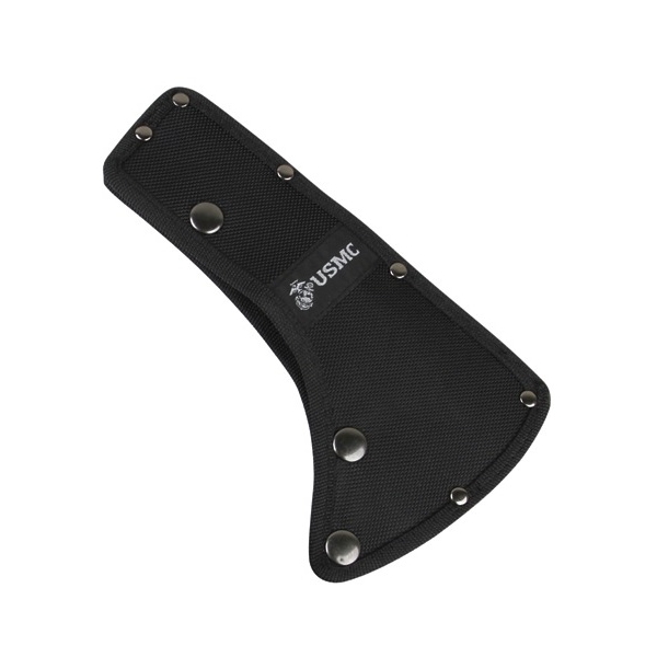Un étui pour la lame de la hache est également inclus dans l'emballage. Le logo et l'inscription USMC sont gravés sur l'étui. La hache est maintenue dans l'étui à l'aide de deux boutons-pression métalliques. À l'arrière de l'étui se trouve une boucle permettant de l'attacher à une ceinture d'environ 5 cm de large. La lame en acier inoxydable noirci est recouverte d'une couche de revêtement antirouille.