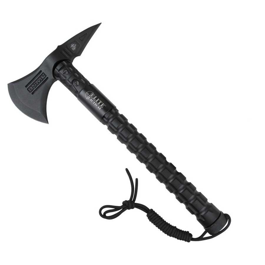 La tête de la hache est fabriquée en acier inoxydable avec un côté classique pour couper et l'autre extrémité est dotée d'une pointe acérée. La lame est noircie, ce qui évite les reflets indésirables si vous avez besoin de vous cacher, de ne pas vous faire repérer par l'ennemi ou un poursuivant. Sur la lame, vous trouverez l'abréviation USMC en relief et le logo imprimé. Le manche est fabriqué en nylon résistant, renforcé de fibre de verre. Le manche est très profilé, ce qui lui confère des propriétés antidérapantes.