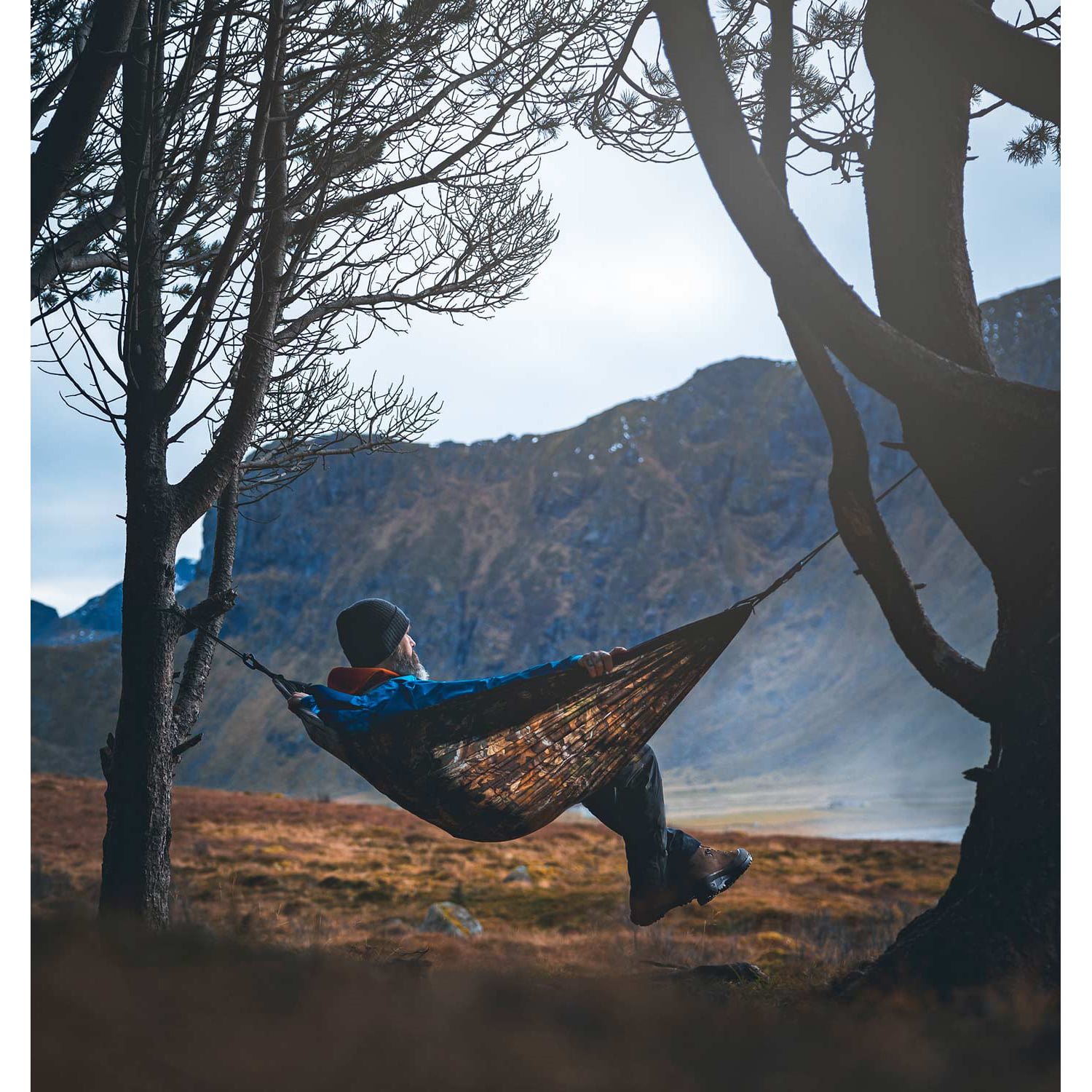 Hamac de voyage ultraléger équipé d'une moustiquaire extra fine (24 à 35 mailles par cm²) protégeant contre la plupart des insectes volants et rampants. Le hamac est fabriqué en nylon ripstop 210D hautement résistant, dans un motif camouflage forestier. L'accès au hamac se fait par une fermeture éclair latérale à double sens.
