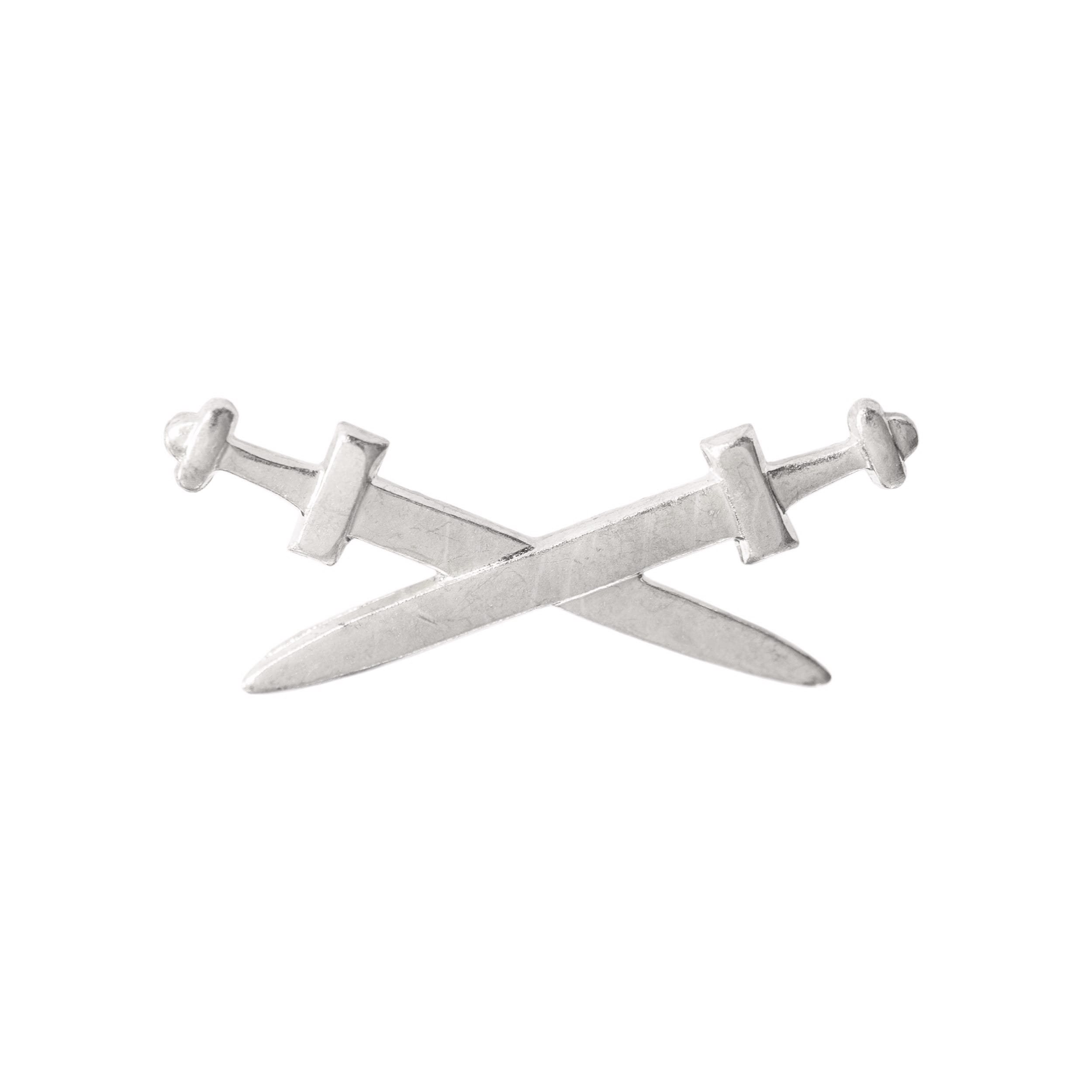 Insigne de revers représentant deux épées croisées en argent. L'insigne se fixe à l'aide de deux épingles à l'arrière. Pièce originale provenant de l'uniforme de l'Armée populaire tchécoslovaque.