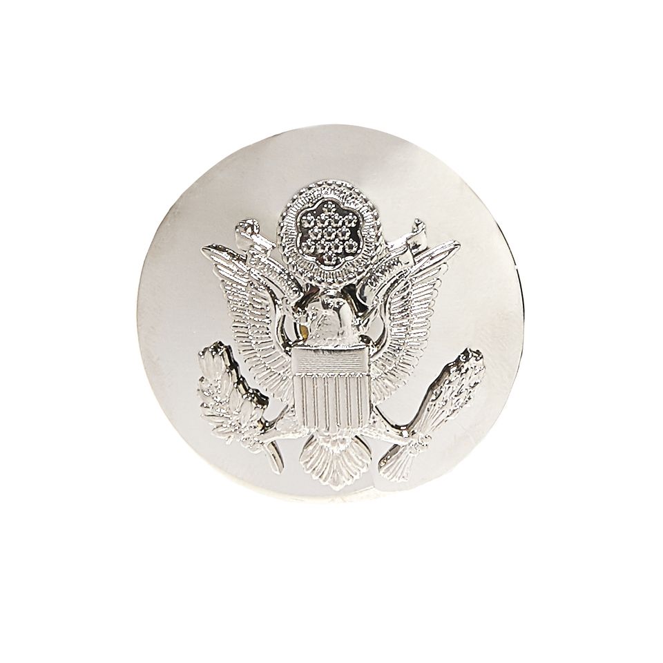 Insigne de casquette US Air Force Officer. Fabriqué en métal avec une surface brillante de couleur argentée. Dimensions de l'insigne : environ 3,2 x 2,9 cm, diamètre de la rondelle : environ 3,8 cm.