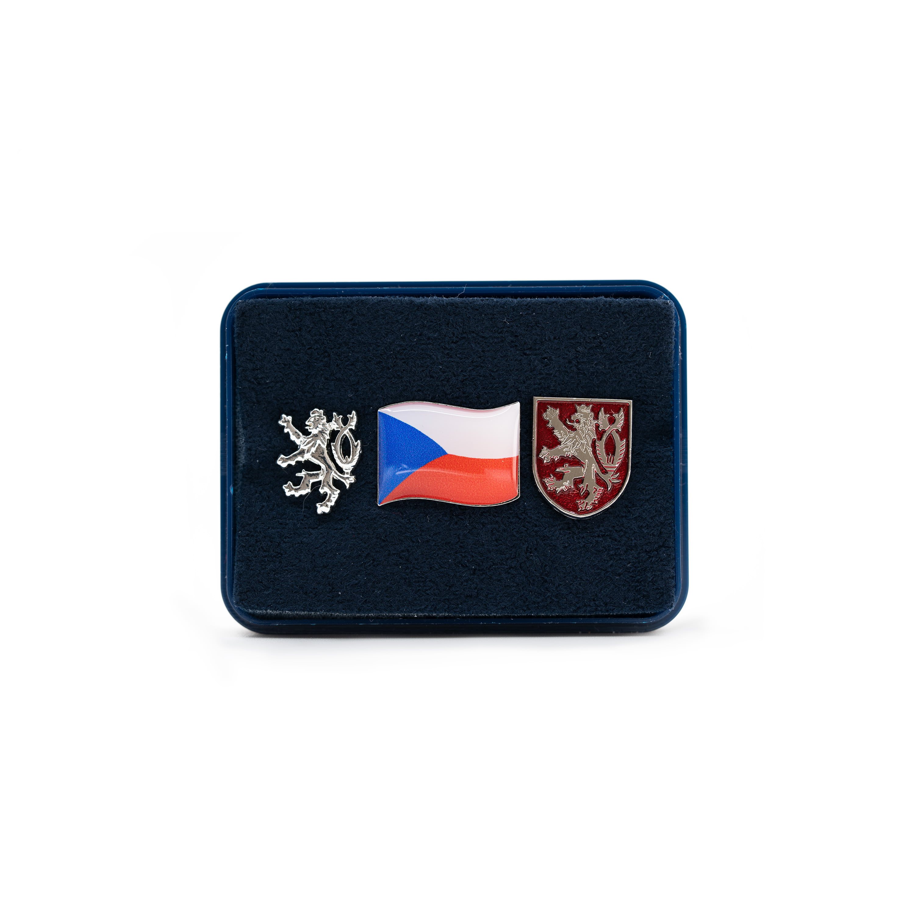 Ensemble comprenant le drapeau de la République tchèque, le lion tchèque et le petit emblème national de la République tchèque. Les insignes sont munis d'une attache à épingle (avec sécurité). Livré dans un coffret cadeau. Fabrication de qualité, produit en République tchèque.