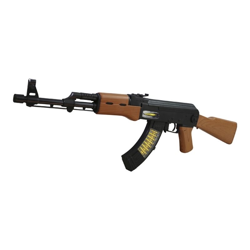 Fusil d'assaut AK-47, connu sous le nom de Kalachnikov, pour petits soldats et petites soldats. Il est sécurisé, ne tire aucune balle, et émet uniquement des sons (coups de feu et chargement) lorsque les piles sont insérées. Le tir est accompagné d'effets lumineux et de vibrations. Le chargeur contient des « balles » visibles. Les tirs sont accompagnés d'effets lumineux et de vibrations. Les « balles » sont visibles dans le chargeur.
