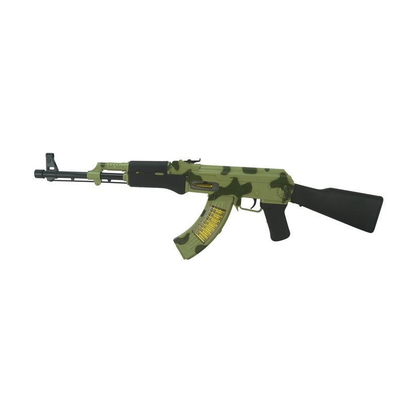 Fusil d'assaut AK-47, connu sous le nom de Kalachnikov, pour petits soldats et petites soldats. Il est sécurisé, ne tire aucune balle, et émet uniquement des sons (tir et chargement) lorsque les piles sont insérées. Le tir est accompagné d'effets lumineux et de vibrations. Le chargeur contient des « balles » visibles. Les tirs sont accompagnés d'effets lumineux et de vibrations. Les « balles » sont visibles dans le chargeur.
