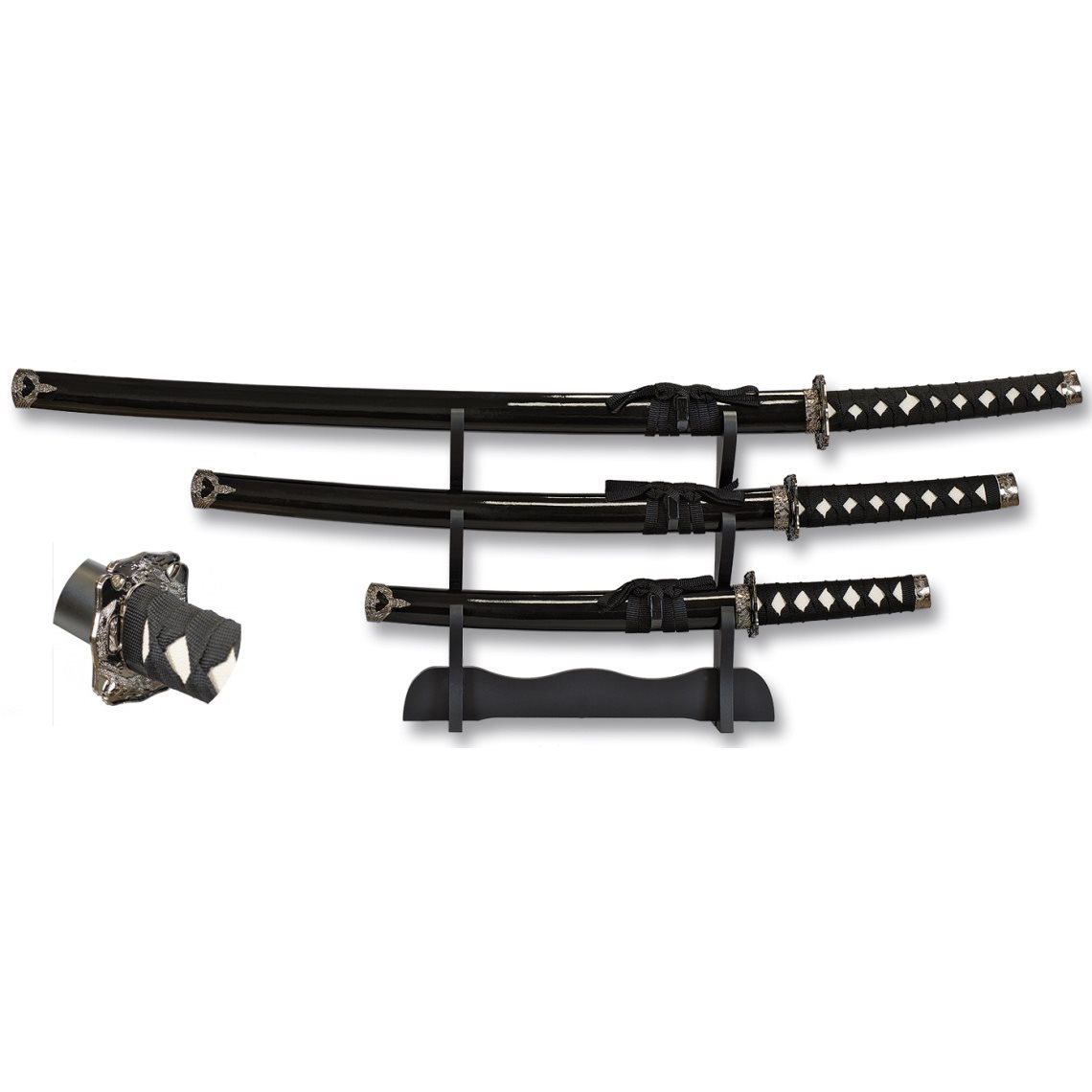 Ensemble de katanas de différentes tailles. Longueur totale des sabres : 95, 71 et 46 cm. La lame est en acier au carbone. Le support est inclus dans l'emballage et constitue une excellente décoration pour n'importe quelle pièce. Plus d'informations