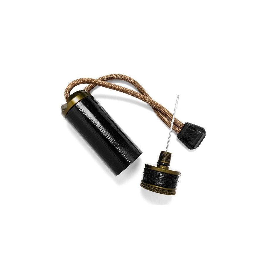 Kit de couture résistant comprenant plusieurs outils utiles. Le boîtier est fabriqué en métal résistant et contient une longue aiguille qui, une fois magnétisée, peut servir de boussole improvisée. À l'extérieur du cylindre contenant l'aiguille, vous trouverez environ 1,3 m de ruban adhésif extra-résistant. Le couvercle est enroulé d'environ 18 m de cordon, qui a été testé avec une charge de 13 kg. L'ensemble peut être suspendu à l'aide d'un cordon Firecord court.