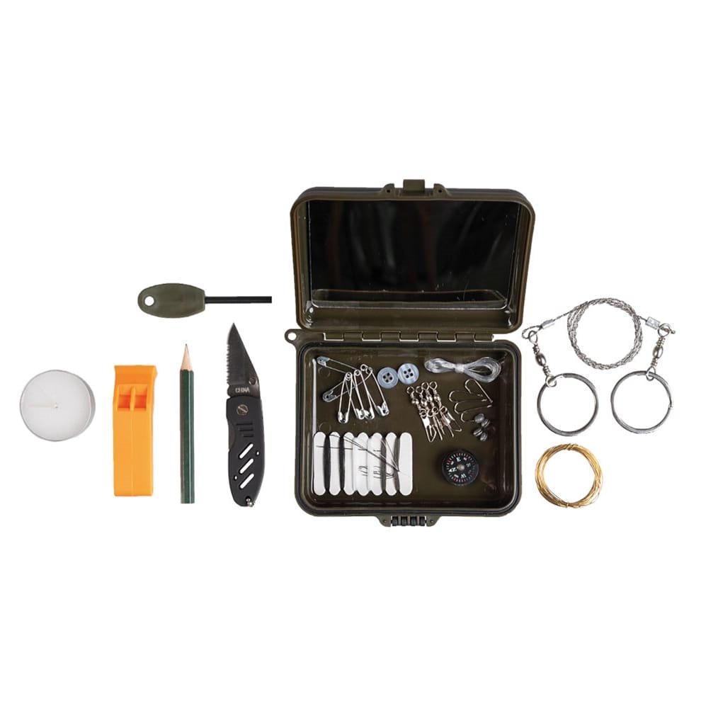 Contenu : petit couteau, scie à métaux, fil de fer, kit de pêche, coton, allumettes, bougie, crayon, mini-boussole, petit kit de couture, épingles de sûreté, briquet, miroir,