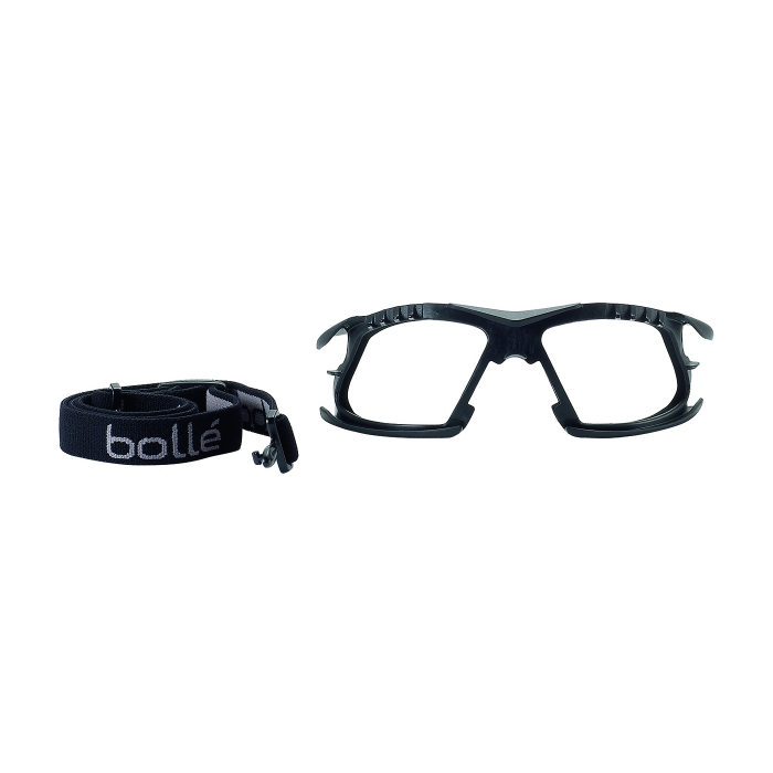 Kit destiné aux lunettes de la gamme RUSH+ de la marque française BOLLÉ. Le kit comprend une monture en plastique noir rembourrée et une sangle élastique réglable avec attaches.