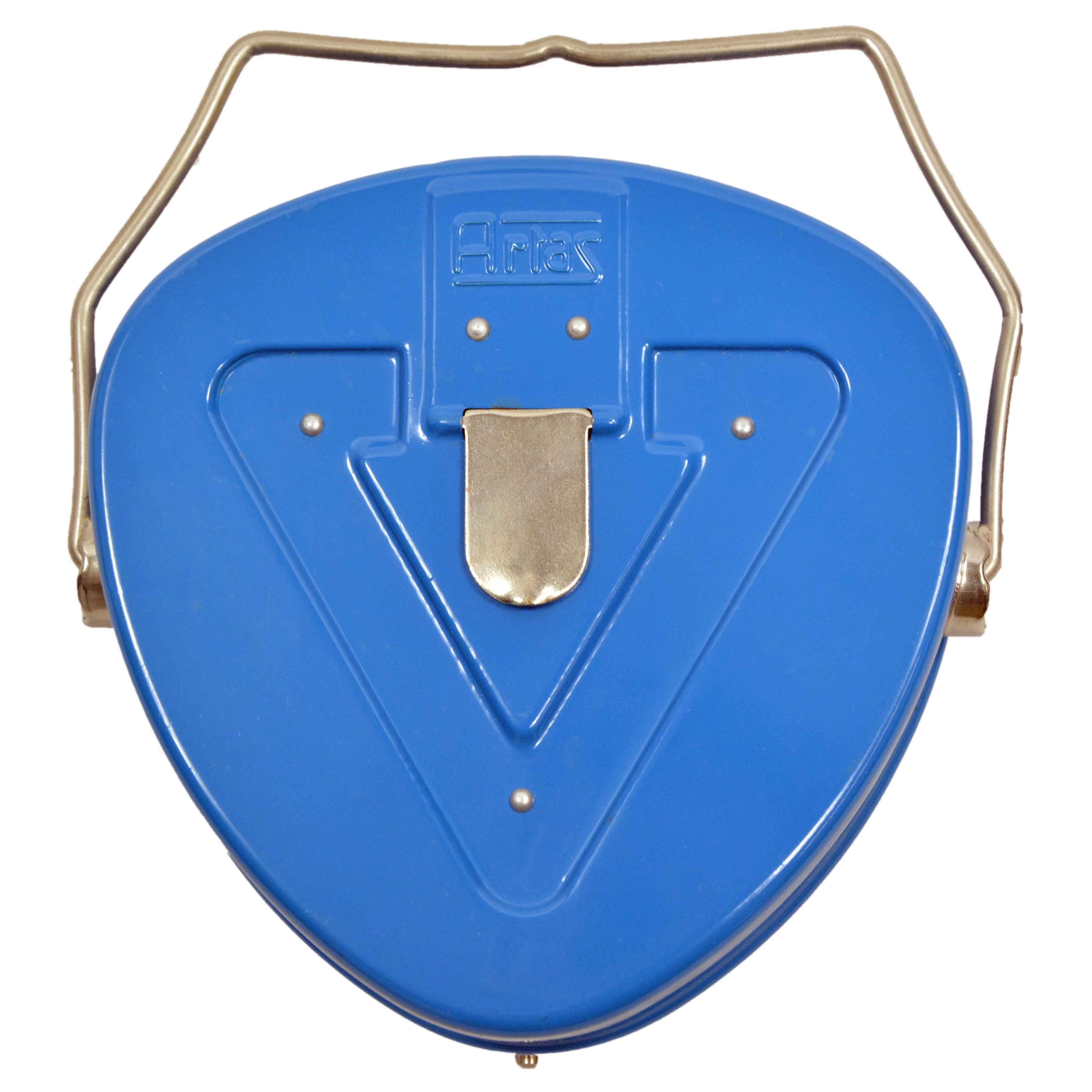 Lampe de camping entièrement fonctionnelle datant de 1975, conçue pour une utilisation en extérieur. Le corps renforcé de la lampe est fabriqué en métal bleu et dispose d'une lumière rouge qui ne perturbe pas la vision nocturne. Pour faciliter son transport, la lampe est équipée d'une poignée métallique rabattable.