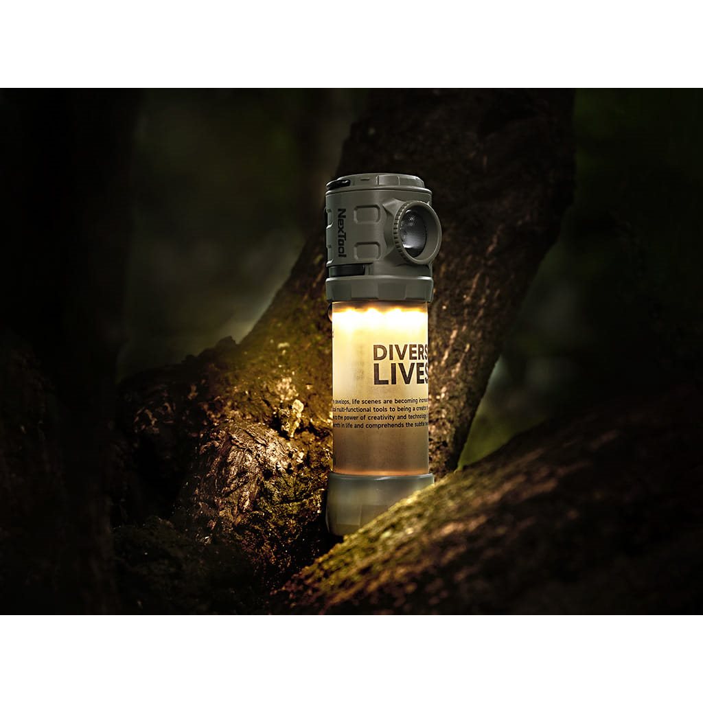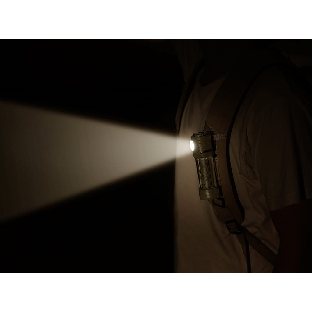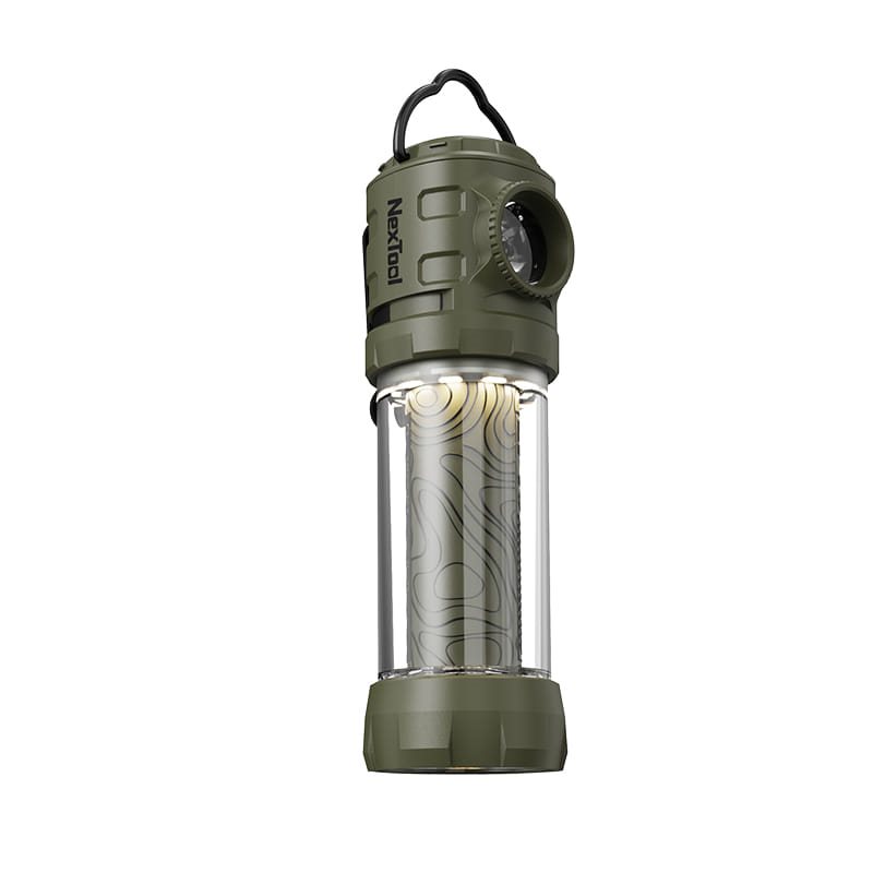 Lampe de camping double avec une puissante lumière LED blanche, complétée par une bande LED jaune dissimulée dans le corps. Le corps est fabriqué en plastique ABS résistant, l'alimentation est assurée par une batterie Li-ion rechargeable via un port USB-C intégré. La lampe est équipée d'une boucle métallique pour la suspendre, d'un clip métallique amovible et d'un filetage inférieur pour trépied. Vous pouvez facilement passer d'un mode à l'autre à l'aide du bouton en caoutchouc situé sur le dessus, combiné à un indicateur d'état de la batterie.