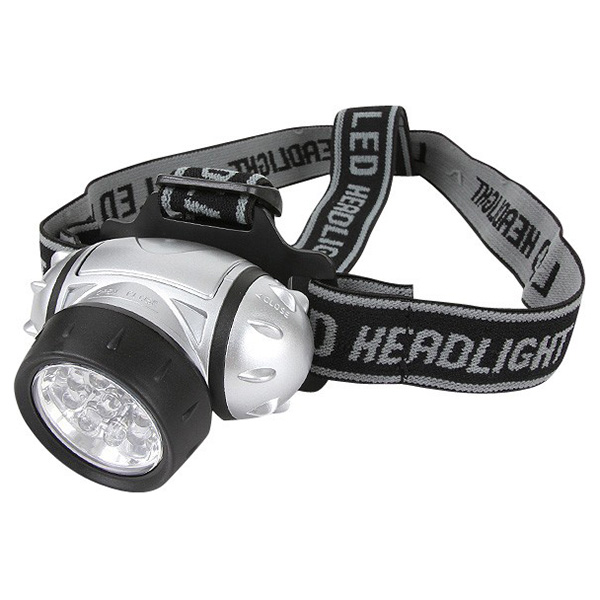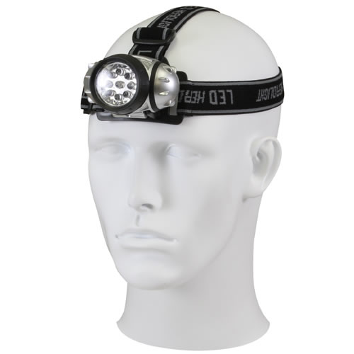 Lampe frontale légère en plastique. Trois modes d'éclairage : 3, 6 et 9 LED. Mode clignotant d'urgence disponible. Sangles réglables pour la tête. Alimentation : 3 piles AAA.
