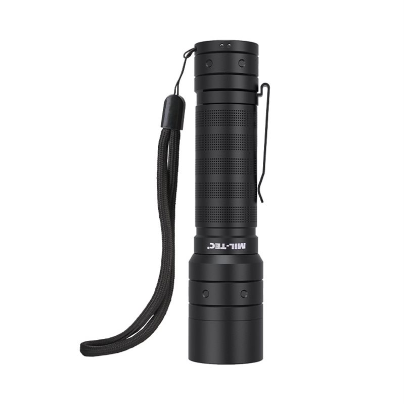 Lampe robuste équipée d'une ampoule puissante Luminus SST-40 d'une puissance maximale de 1 000 lumens et d'une portée jusqu'à 300 m. Le boîtier dispose d'une résistance IPX4 qui le protège des projections d'eau. L'alimentation est assurée par une batterie lithium 18650, ou par l'adaptateur fourni pour 3 piles AAA. Le faisceau lumineux émis par la lampe est réglable en tournant la tête. Une fois allumée, vous disposez de quatre modes d'éclairage (fort, moyen, faible, stroboscopique). Le produit est livré avec une dragonne amovible, un étui en polyester, un câble USB rechargeable et un coffret cadeau élégant.