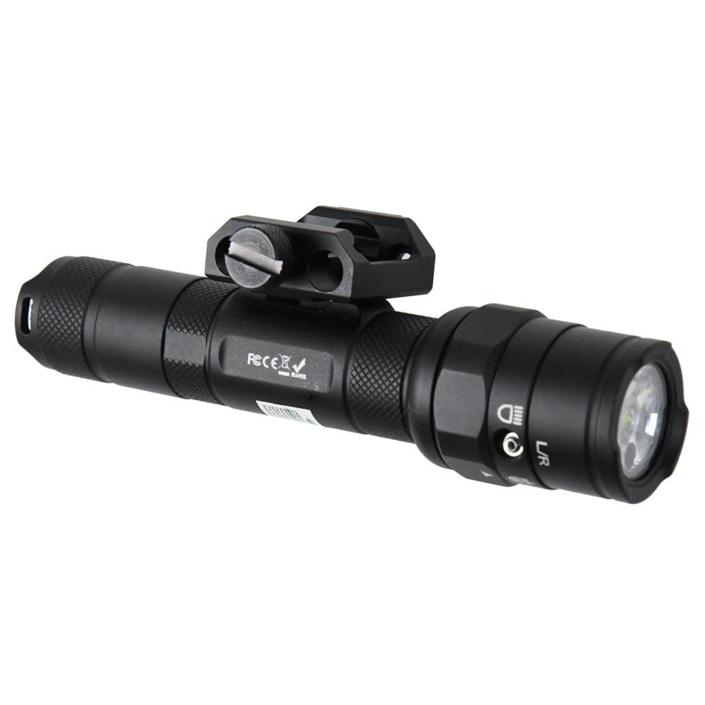 Contenu de l'emballage : lampe, fixation sur rail RIS, interrupteur à pression, batterie 18650, câble de recharge USB, clés Allen, velcro, mode d'emploi