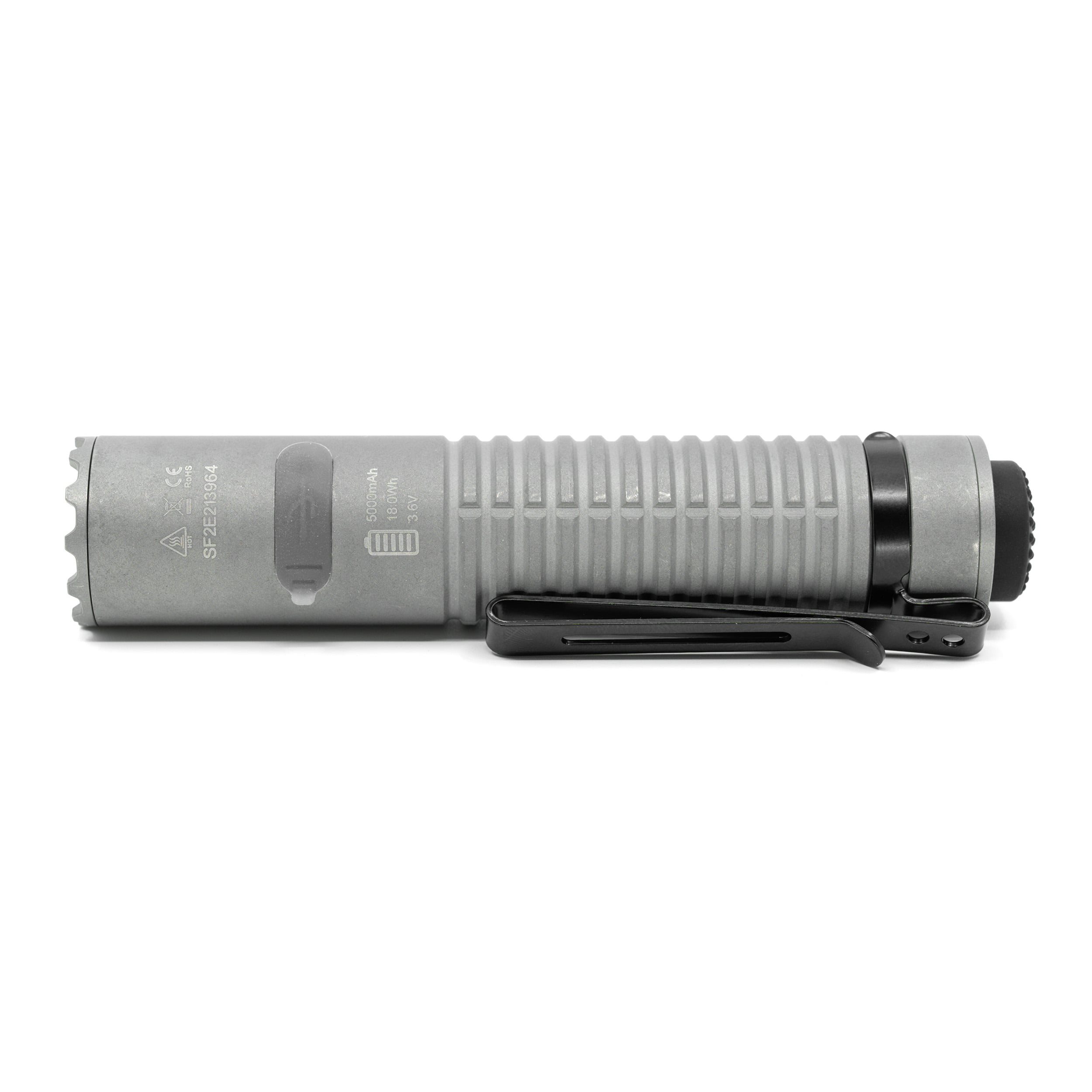 Lampe tactique compacte qui, grâce à l'utilisation d'une diode LED LUMINUS SST40 de qualité supérieure, offre une puissance maximale de 2000 lumens avec une portée de 322 mètres. Le corps de la lampe est fabriqué en alliage de titane résistant avec un indice de protection IP68, qui garantit une résistance à l'eau et à la poussière. La tête de la lampe est équipée de protubérances pouvant être utilisées, si nécessaire, pour briser une vitre ou pour se défendre. Sur le corps, vous trouverez également un clip métallique amovible permettant de la fixer à votre équipement. La lampe dispose de deux modes d'éclairage principaux : outdoor et tactique, qui diffèrent par leur approche des différents modes de la lampe. Pour une utilisation pratique de la lampe, un double bouton situé en dessous peut être enfoncé de manière classique ou pressé sur le côté. La lampe peut être allumée facilement avec des gants, ce qui la rend idéale pour les professionnels en service, qu'il s'agisse de policiers, de militaires, de pompiers ou autres.