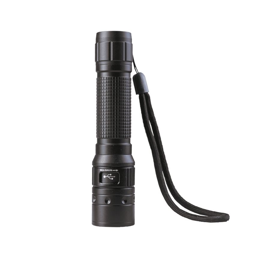 Lampe rechargeable robuste équipée d'une ampoule LED CREE XPG3. L'alimentation est assurée par une batterie intégrée 18650, qui se recharge via un port micro USB dissimulé. La lampe offre trois modes d'éclairage (puissance minimale, puissance maximale et stroboscope) et est livrée avec une dragonne, un étui en polyester et un câble USB.