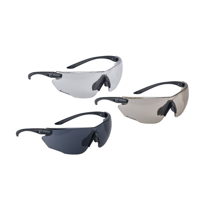 Lunettes de protection balistiques Bolle Combat avec trois verres interchangeables, conformes à la norme civile EN 166 pour les équipements de protection et à la norme militaire OTAN STANAG 4296 pour la résistance balistique.