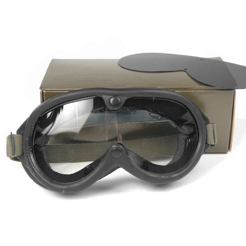 Lunettes de protection provenant de l'équipement de l'armée américaine. Elles sont adaptées pour la protection contre la poussière et le vent. Verres transparents et foncés (en plastique).