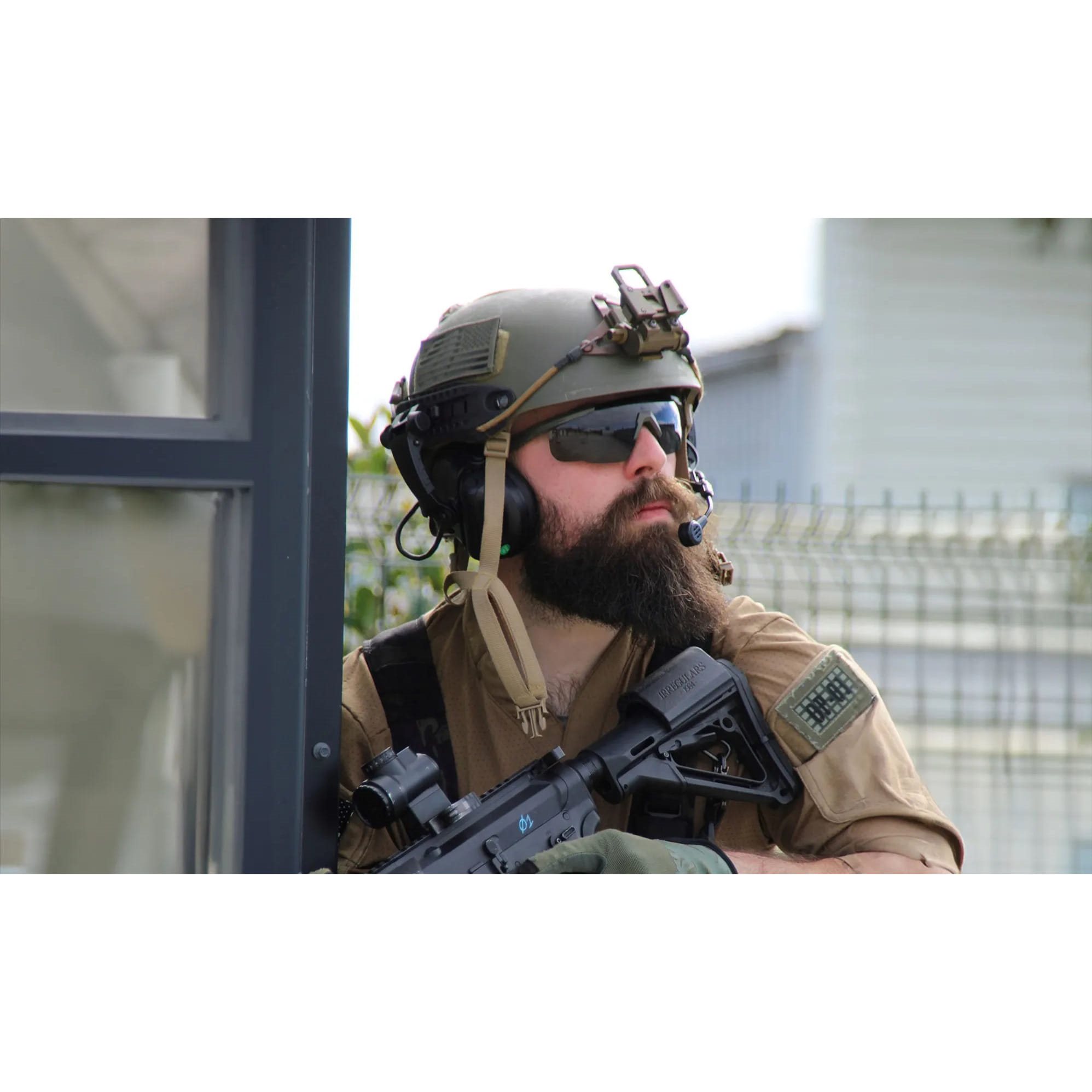 Les verres des lunettes sont fabriqués à partir d'un matériau polycarbonate haut de gamme , le Selenite™. Celui-ci ne se brise pas lorsqu'il est touché par un projectile et dispose en outre d'un revêtement T-SHELL™ qui le protège contre les rayures indésirables. Grâce à leur largeur, les verres ne limitent ni ne déforment la vision. La monture est fabriquée à partir de nylon Triloid™, l'un des matériaux non métalliques les plus résistants utilisés dans la fabrication de lunettes. Les branches des lunettes sont télescopiques et peuvent être remplacées par la sangle élastique fournie, selon les besoins de l'utilisateur. Le pont peut être facilement ajusté à votre nez. Les lunettes sont compatibles avec la vision nocturne (NVG).