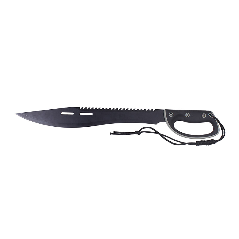 Machette avec lame de 45 cm /18"/ en acier inoxydable 3Cr13, avec bord supérieur dentelé. Manche en plastique en forme de D. Longueur totale 61 cm. Livrée avec étui en polyester et boucle pour ceinture.