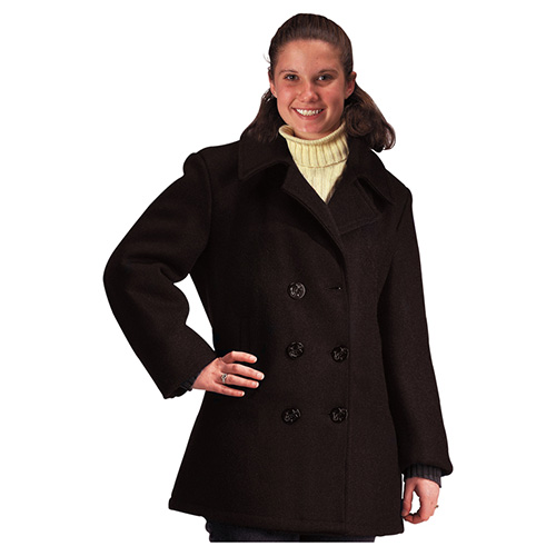 Élégant manteau en laine pour femme, de style marin (Peacoat). Il est confectionné dans un tissu épais avec une doublure en nylon matelassée.