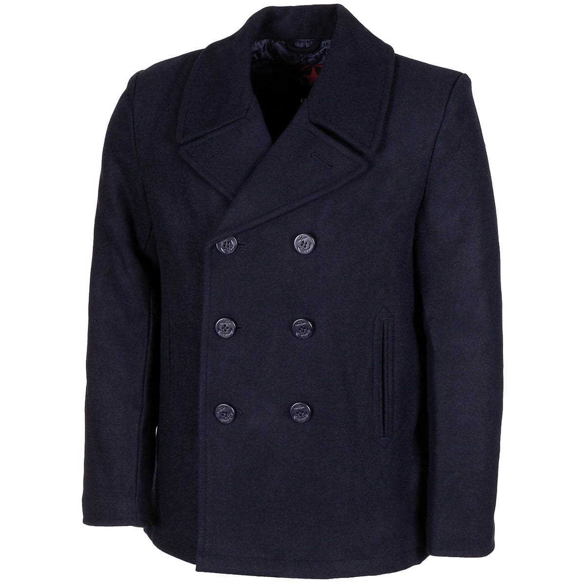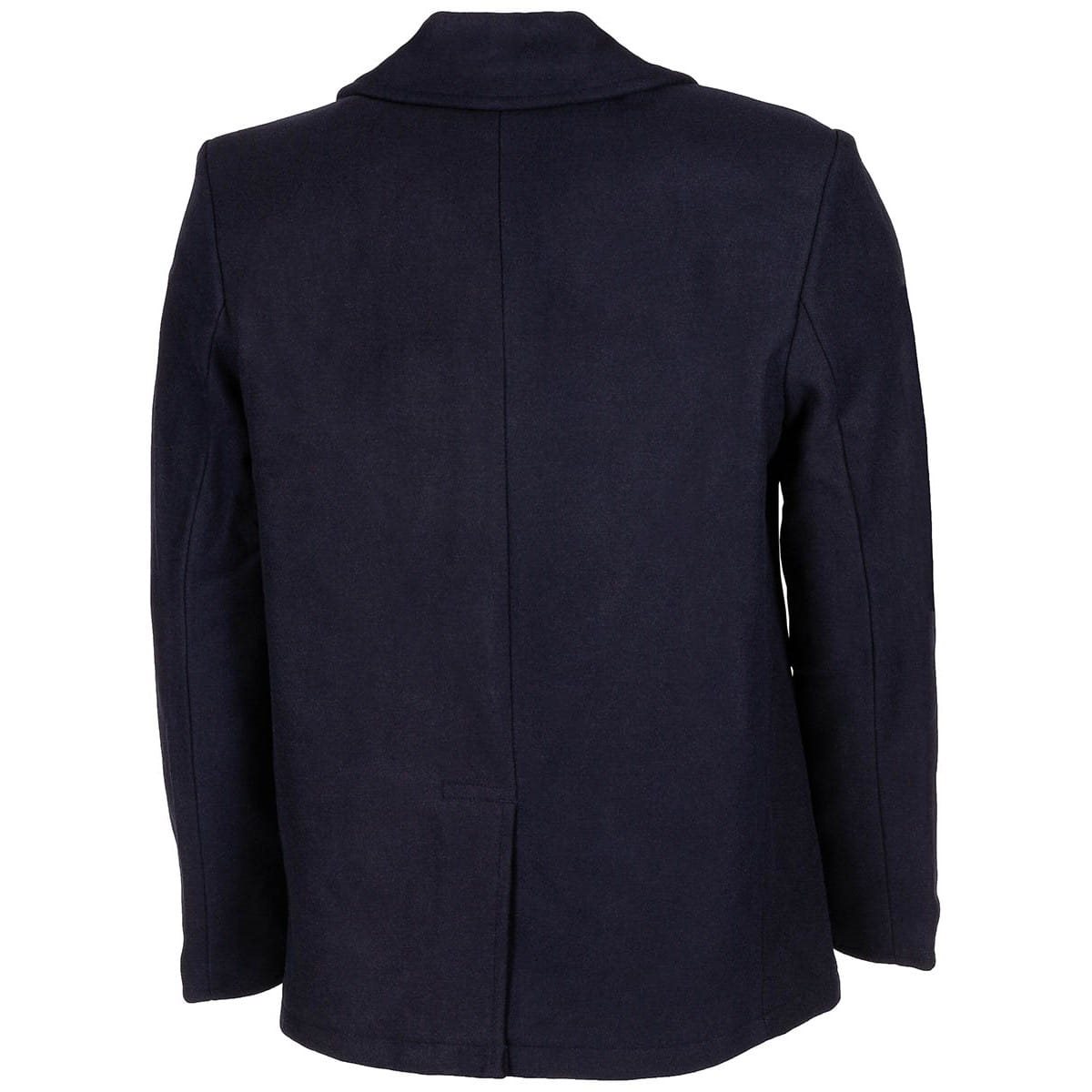 Manteau classique en laine Pea Coat utilisé par la marine américaine, avec fermeture double boutonnage caractéristique et motif d'ancre sur les boutons. Le manteau comporte deux poches extérieures et une poche intérieure, la doublure est matelassée.