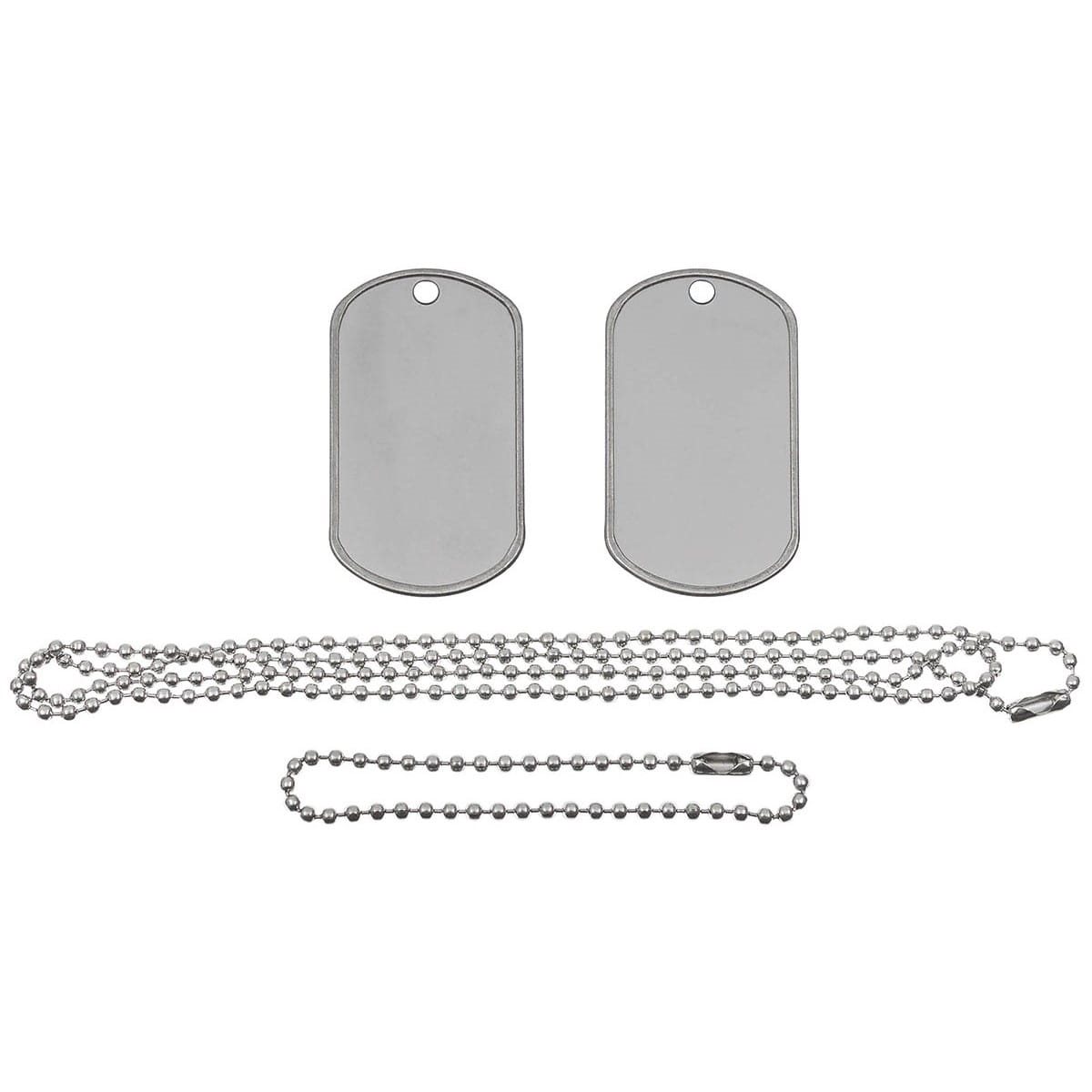 Ensemble de plaques d'identité (dog tags), chaînes incluses. Il comprend deux plaques en acier inoxydable et deux chaînes nickelées (une longue et une courte).