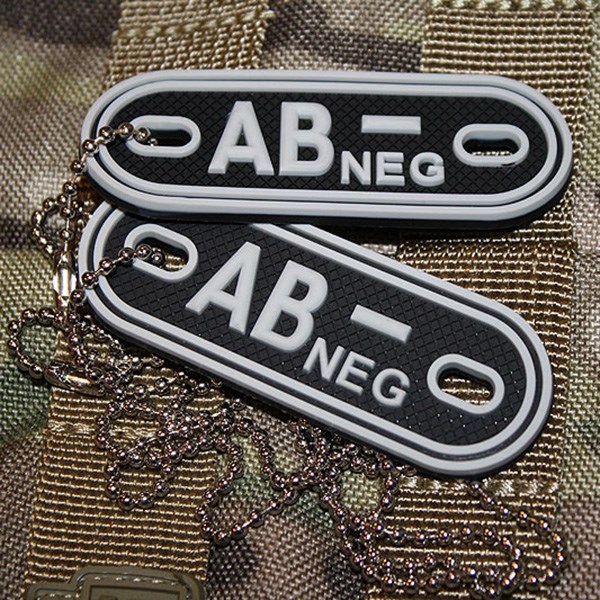 « Plaques d'identification » indiquant le groupe sanguin (AB-/négatif). Deux plaques sur une chaîne. Dimensions : 7 x 2,5 cm.