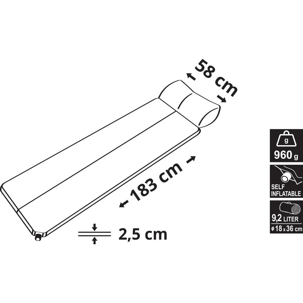 Le matelas autogonflant est doté d'un noyau en mousse hautement poreuse laminé dans un tissu imperméable. Dimensions : 183 x 58 cm, épaisseur : 2,5 cm. Plus d'informations
