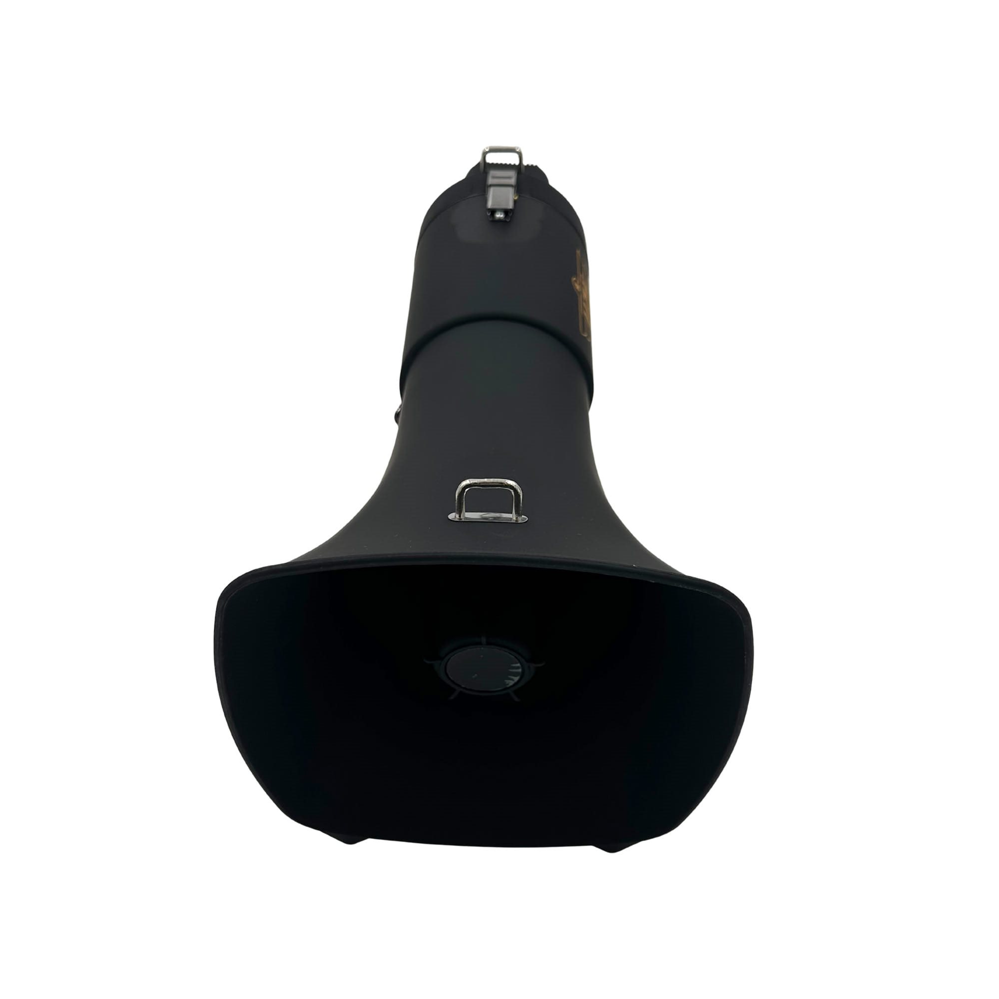 Mégaphone professionnel d'une puissance de 50 W avec une portée allant jusqu'à 500 m. Le corps du mégaphone est fabriqué en plastique ABS, qui offre un excellent rapport résistance/poids. Il constitue une aide précieuse pour les enseignants lors des sorties scolaires, pour les éducateurs lors des classes vertes, pour les manifestants, pour les supporters sportifs, lors de réunions et partout où la voix normale ne suffit pas ou lorsque vous souhaitez simplement ménager vos cordes vocales. L'appareil est équipé d'un microphone externe et d'un haut-parleur, d'un contrôleur de volume, d'un voyant LED, de la technologie Bluetooth, d'une sirène, ainsi que d'un dispositif d'enregistrement (boucle d'enregistrement) et d'une fonction de lecture arrière, qui sert à enregistrer et à rejouer la parole, éliminant ainsi la nécessité de répéter constamment le même texte. Le mégaphone est alimenté par une batterie rechargeable fournie ou par huit piles mono de type C (non fournies). La batterie est équipée d'une prise de type américain, il est nécessaire d'acheter un adaptateur approprié pour la recharger sur des prises européennes.