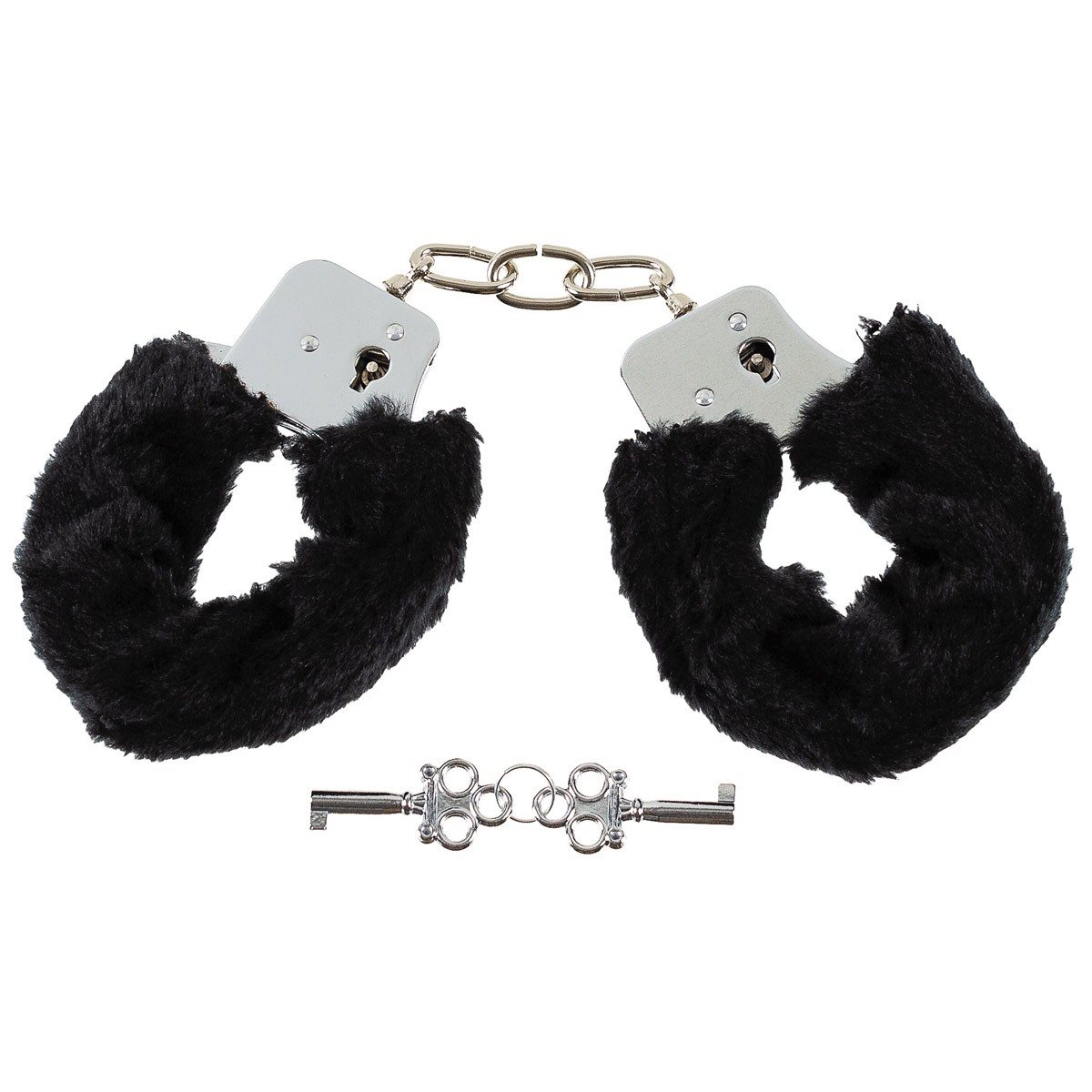 Menottes avec revêtement en peluche douce de couleur noire. Livrées avec deux clés.