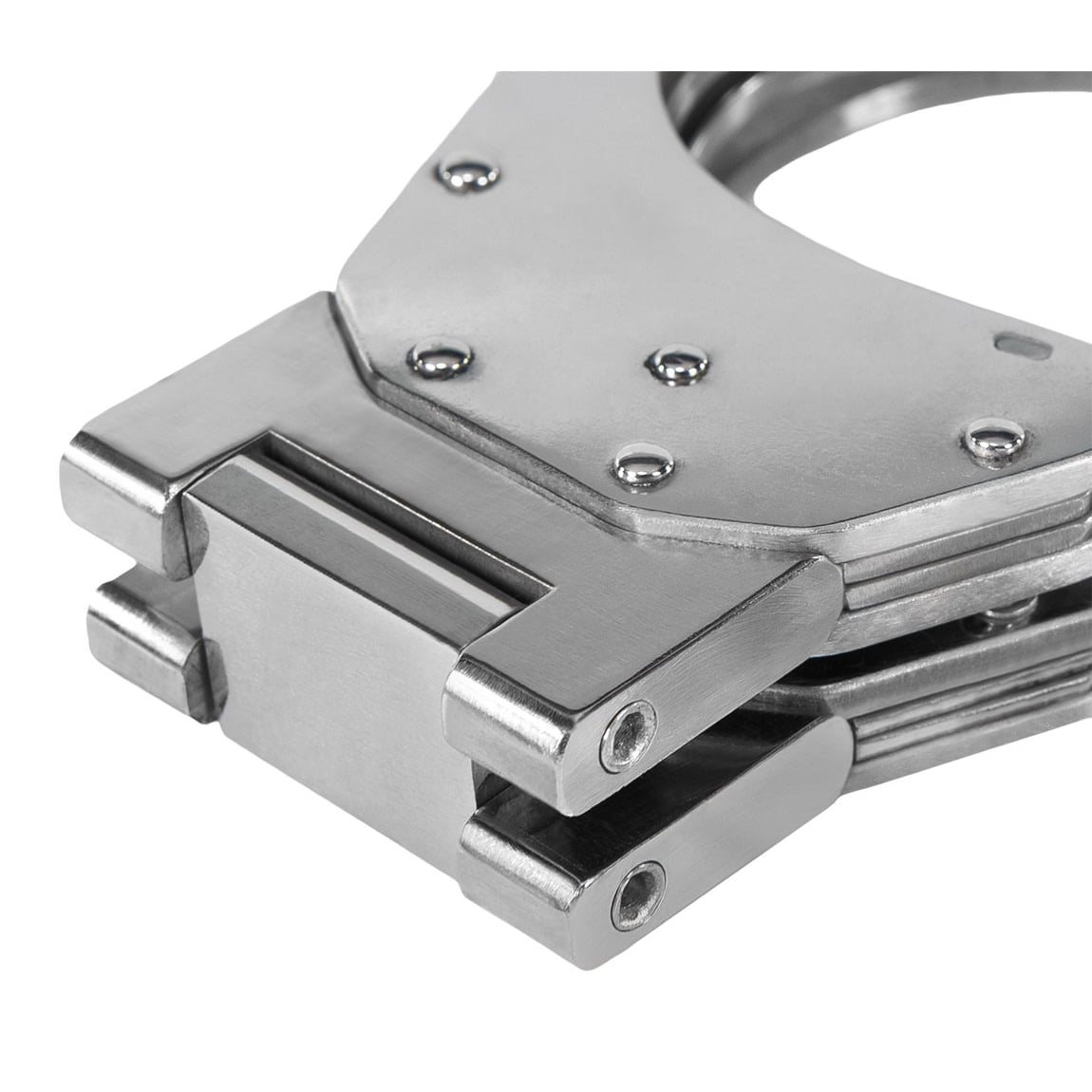 Le charnière en acier inoxydable qui relie les deux parties des menottes ne permet de les ouvrir que jusqu'à un angle de 180°. La conception des menottes limite considérablement les mouvements des mains de la personne menottée et minimise le risque de déverrouillage involontaire. Les trous de serrure sont orientés vers le torse de la personne menottée et sont donc hors de portée de ses mains.