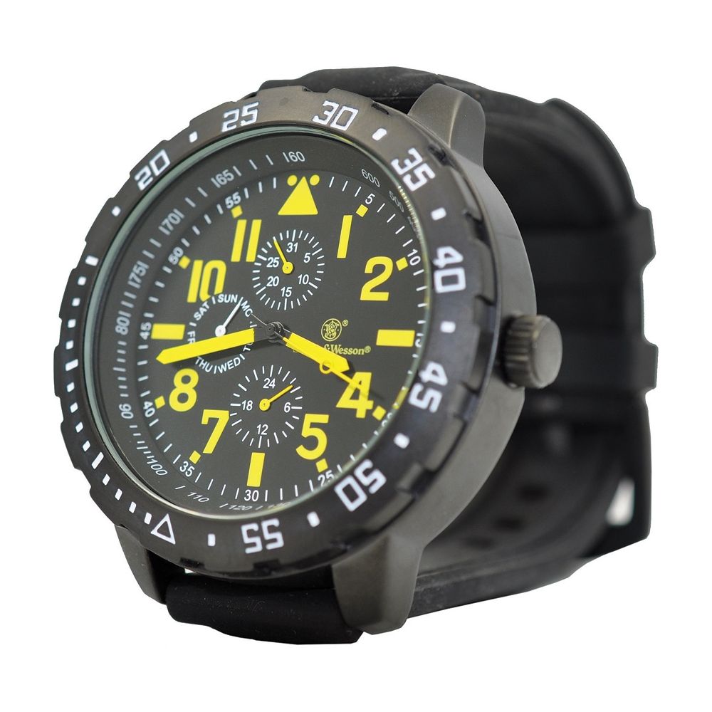 Montre de qualité de la célèbre marque Smith & Wesson, portant le nom de CALIBRATOR. Ce réveil relativement imposant est fabriqué en acier inoxydable noir avec des chiffres jaunes, et son fonctionnement est assuré par un mouvement à quartz japonais de haute précision. Les petits cadrans indiquent la date et le jour de la semaine (abréviations anglaises). Le verre minéral trempé résiste aux rayures dans des conditions d'utilisation normales. Le verre minéral trempé résiste aux rayures dans le cadre d'une utilisation normale. La montre est étanche jusqu'à 50 mètres, ce qui en fait un accessoire idéal pour tous les aventuriers et les touristes. Elle est également très appréciée des forces armées. Le bracelet en caoutchouc, très confortable, est cousu avec du fil. L'étanchéité est garantie jusqu'à 50 mètres : elle résiste aux éclaboussures, à la pluie,