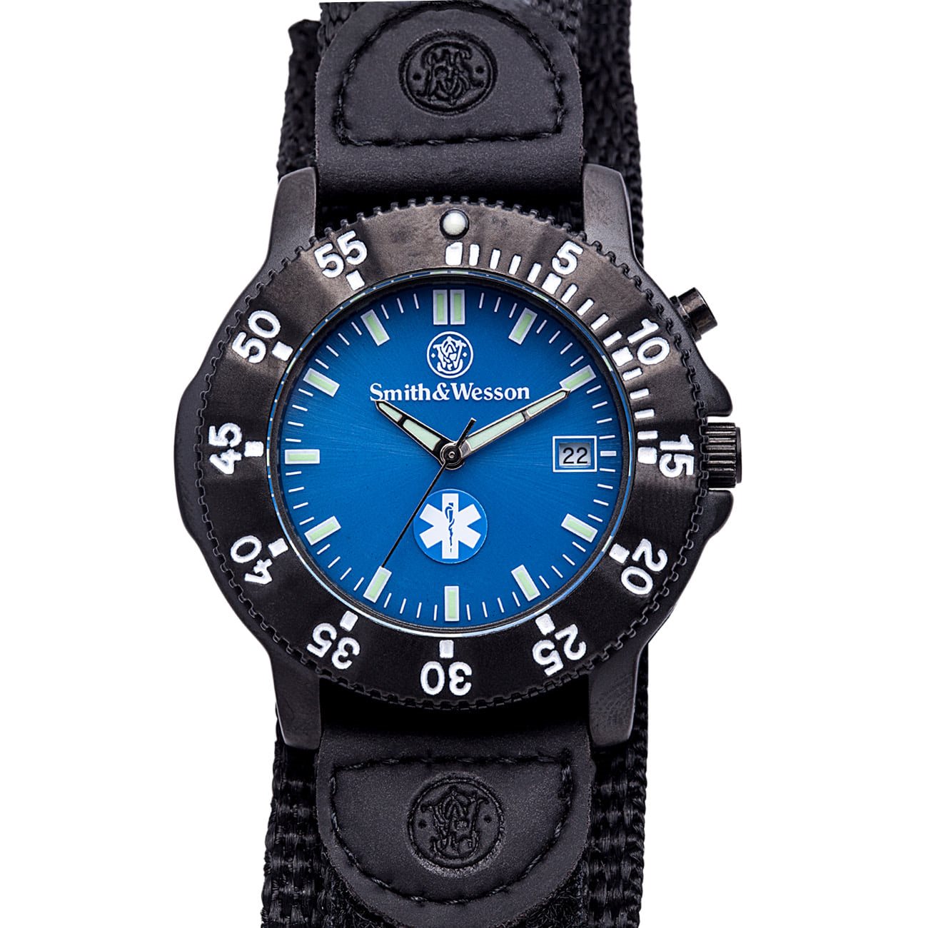 Montre élégante avec le logo EMT (Emergency Medical Technician) et un réveil bleu. La montre est équipée d'un mouvement japonais et est étanche jusqu'à 30 mètres (lavage des mains, averses, éclaboussures). Le cadran est protégé par un verre minéral résistant aux rayures et les trois aiguilles indiquent les heures, les minutes et les secondes. Le bracelet est en nylon.