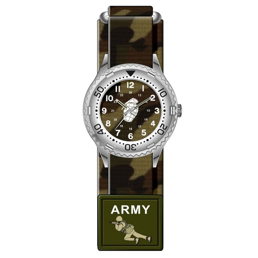 Montre classique à aiguilles destinée aux enfants qui apprécient les articles militaires. Design camouflage, image d'une grenade au centre du cadran.