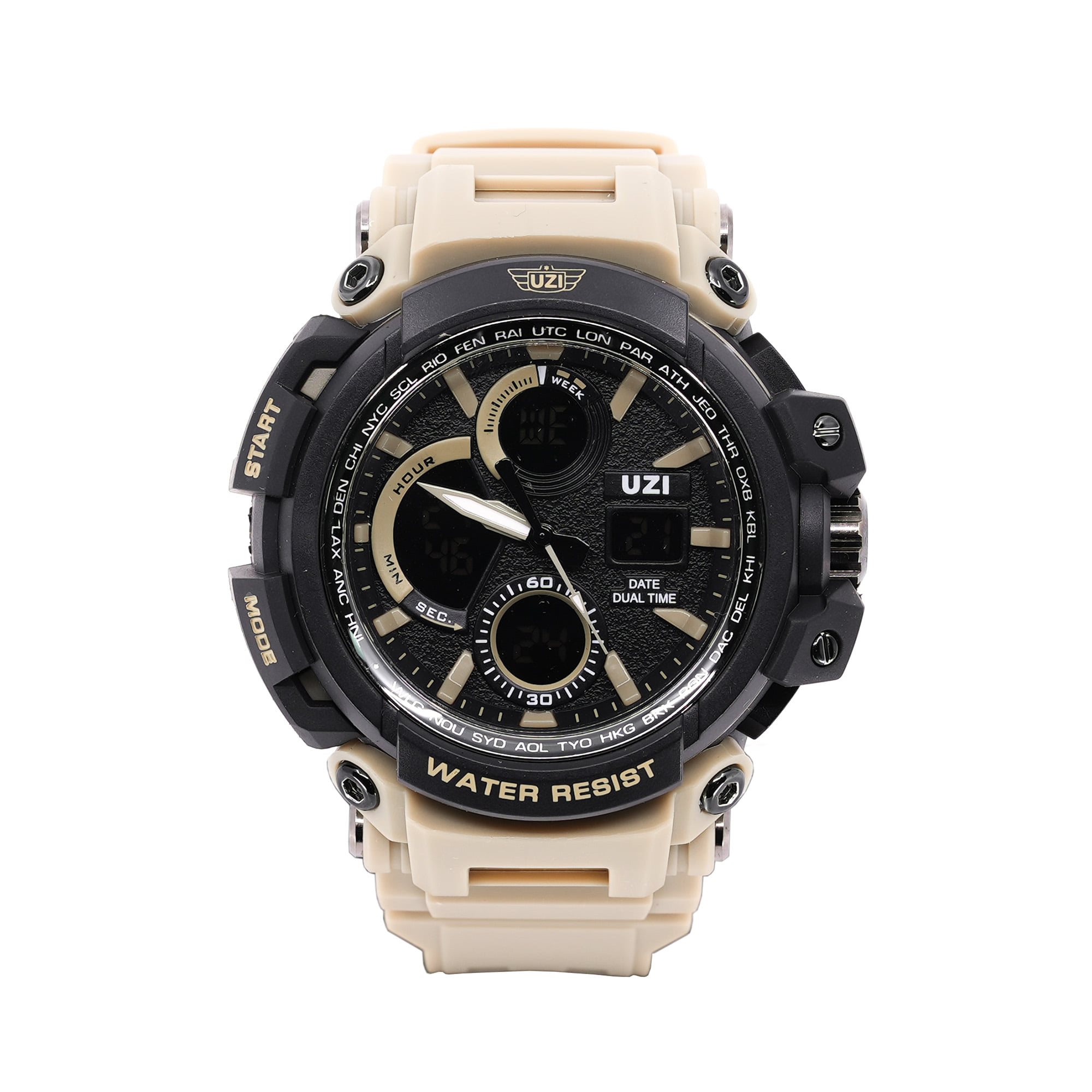 Montre résistante et confortable pour un usage quotidien. Le boîtier de la montre est fabriqué en ABS solide et le cadran est recouvert d'un verre résistant aux rayures. Elle est étanche jusqu'à 30 mètres (lavage des mains, averses, éclaboussures). Le fond de la montre est protégé par un morceau d'acier inoxydable 304 qui améliore l'étanchéité. Le bracelet en caoutchouc souple est agréable au toucher et peut être ajusté avec précision à la largeur du poignet de l'utilisateur. La montre peut être réglée sur deux fuseaux horaires et dispose d'un réveil, d'un chronographe, d'un dateur et d'un chronomètre.