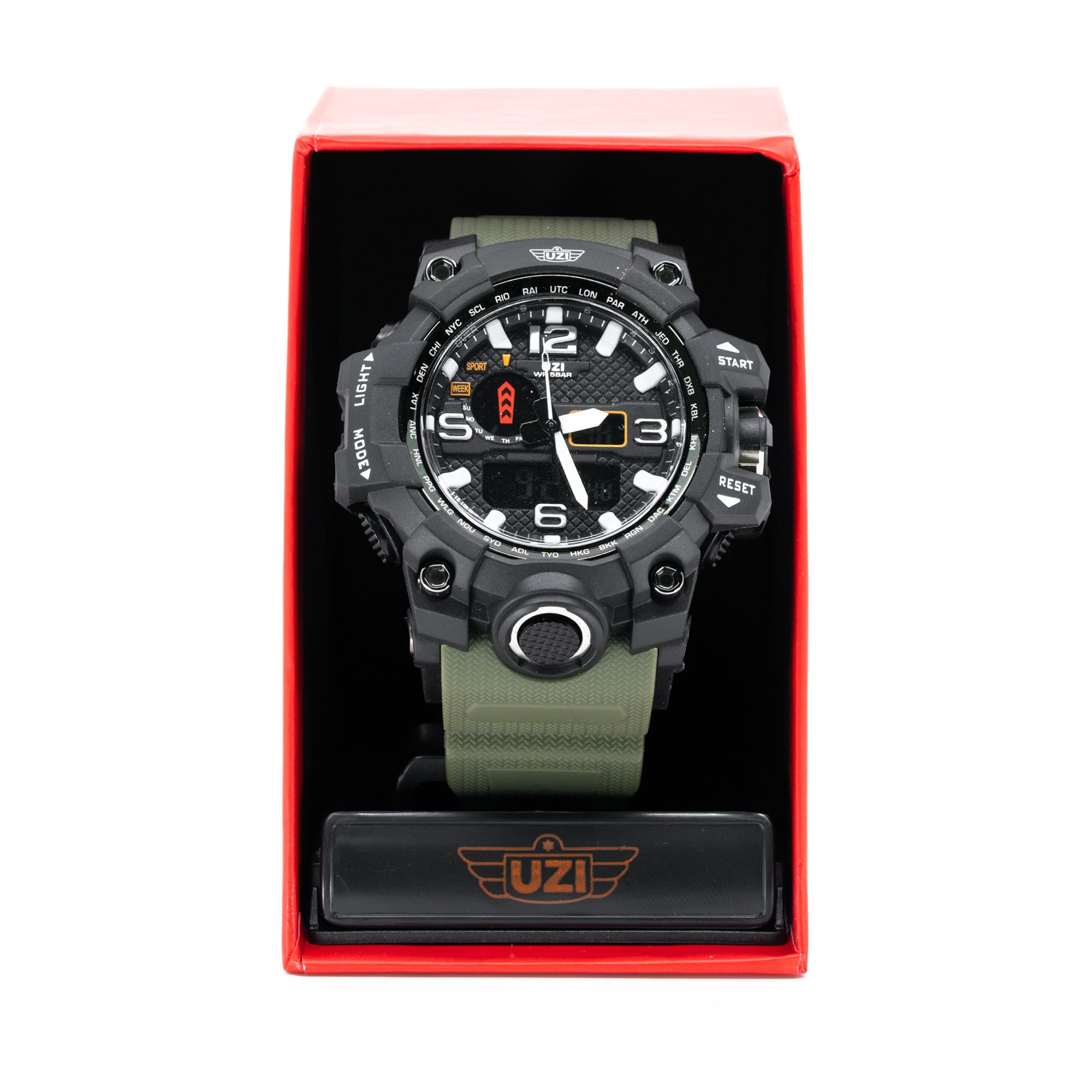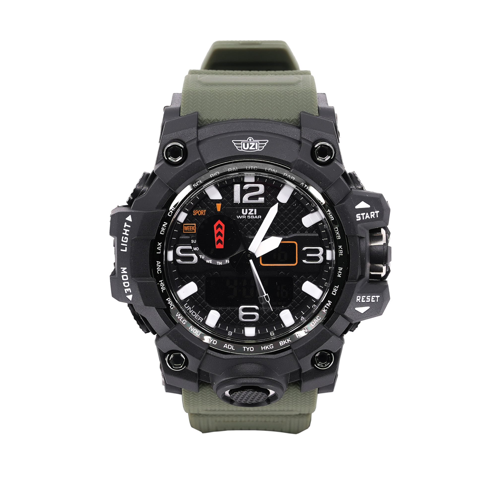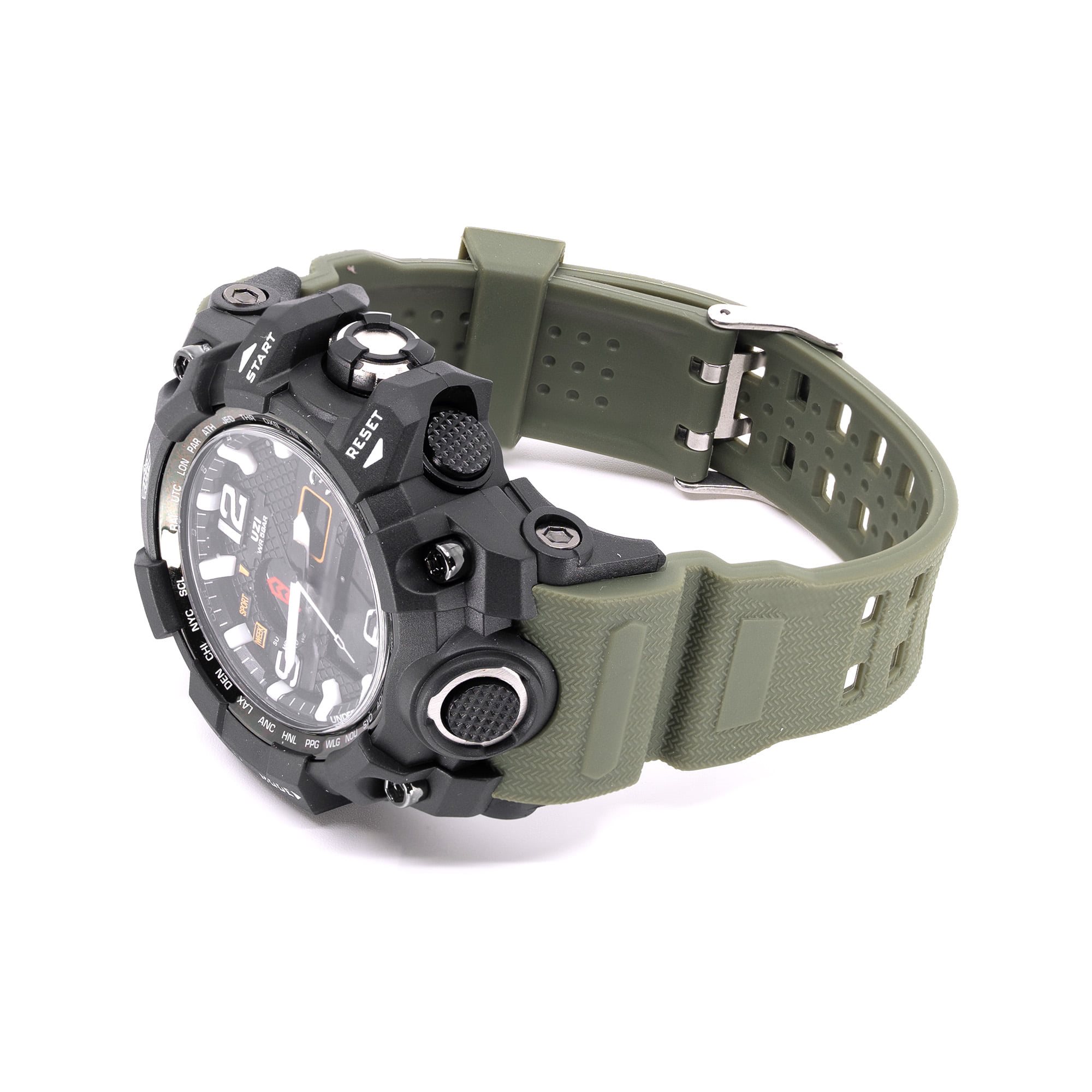 Montre résistante et confortable pour un usage quotidien. Le boîtier de la montre est fabriqué en ABS solide et le cadran est recouvert d'un verre résistant aux rayures. Elle est étanche jusqu'à 30 mètres (lavage des mains, averses, éclaboussures). Le fond de la montre est protégé par un morceau d'acier inoxydable 304 qui améliore l'étanchéité. Le bracelet en caoutchouc souple est agréable au toucher et peut être ajusté avec précision à la largeur du poignet de l'utilisateur. La montre peut être réglée sur deux fuseaux horaires et dispose d'un réveil, d'un chronographe, d'un dateur et d'un chronomètre.