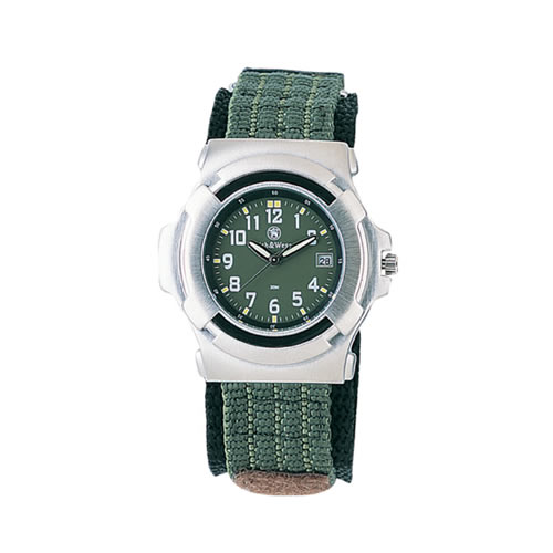 Montre précise et étanche avec fermeture velcro. Cadran argenté. Date. Aiguilles et chiffres luminescents. Bracelet en nylon olive avec fermeture velcro. Étanchéité 30 m. Plus d'informations