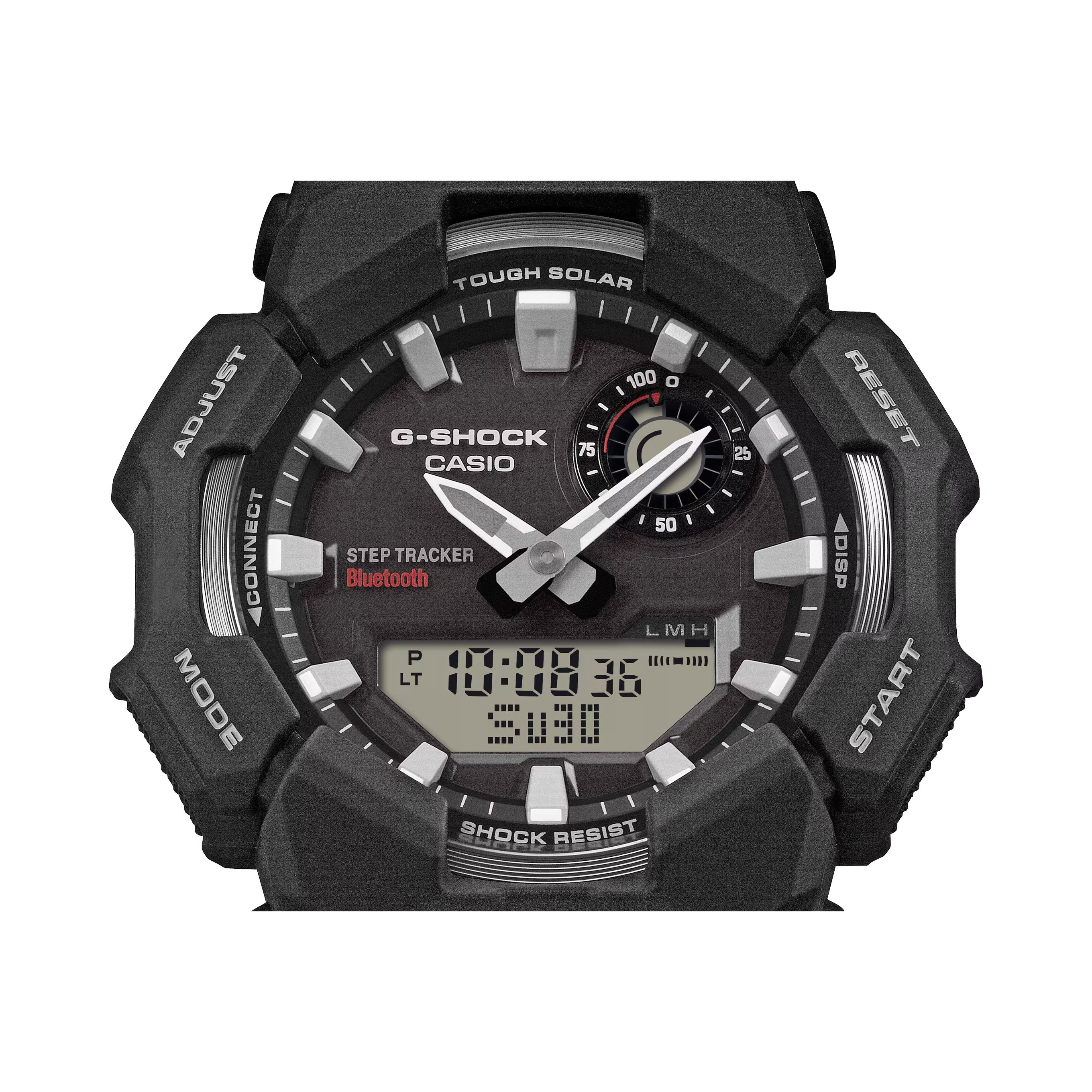 Modèle de montre G-SHOCK très résistant, à recharge solaire et connectable via Bluetooth. Grâce à la connexion avec l'application CASIO WATCHES, il est possible de synchroniser facilement l'heure, de régler l'heure mondiale (en choisissant parmi plus de 300 villes), l'alarme, les comptes à rebours et, bien sûr, d'avoir un aperçu du nombre de pas, sur la base duquel il est possible de calculer les calories brûlées et la réalisation de l'objectif quotidien. La fonction Phone finder, qui permet de retrouver facilement son téléphone, constitue également un avantage non négligeable.