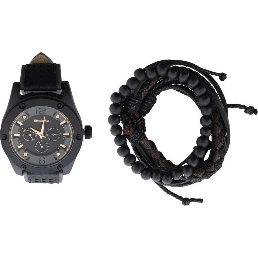 Le boîtier de la montre est en métal noir brillant, le bracelet en cuir est de couleur marron et noire. Au centre du cadran figure le nom du fabricant : Remington. Verre minéral.